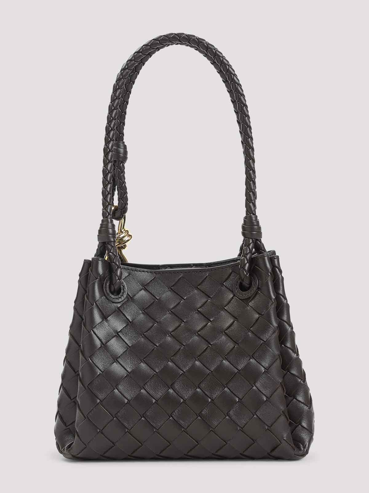 Bottega veneta parachute small brown lamb leather handbag. crafted from brown intrecciato lamb leather, gold-toned hardware, twisted handles with metal knot detail, concealed magnetic fastening, attachable and adjustable shoulder strap.