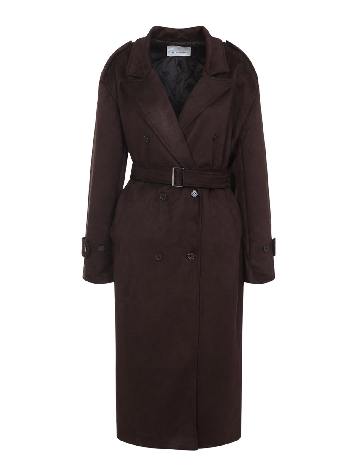 The frankie shop brown pembroke faux trench pure brown notched collar buttoned double, breasted design tonal adjustable belt side pockets long sleeves buttoned strap on the cuffs ankle, length straight hem fully