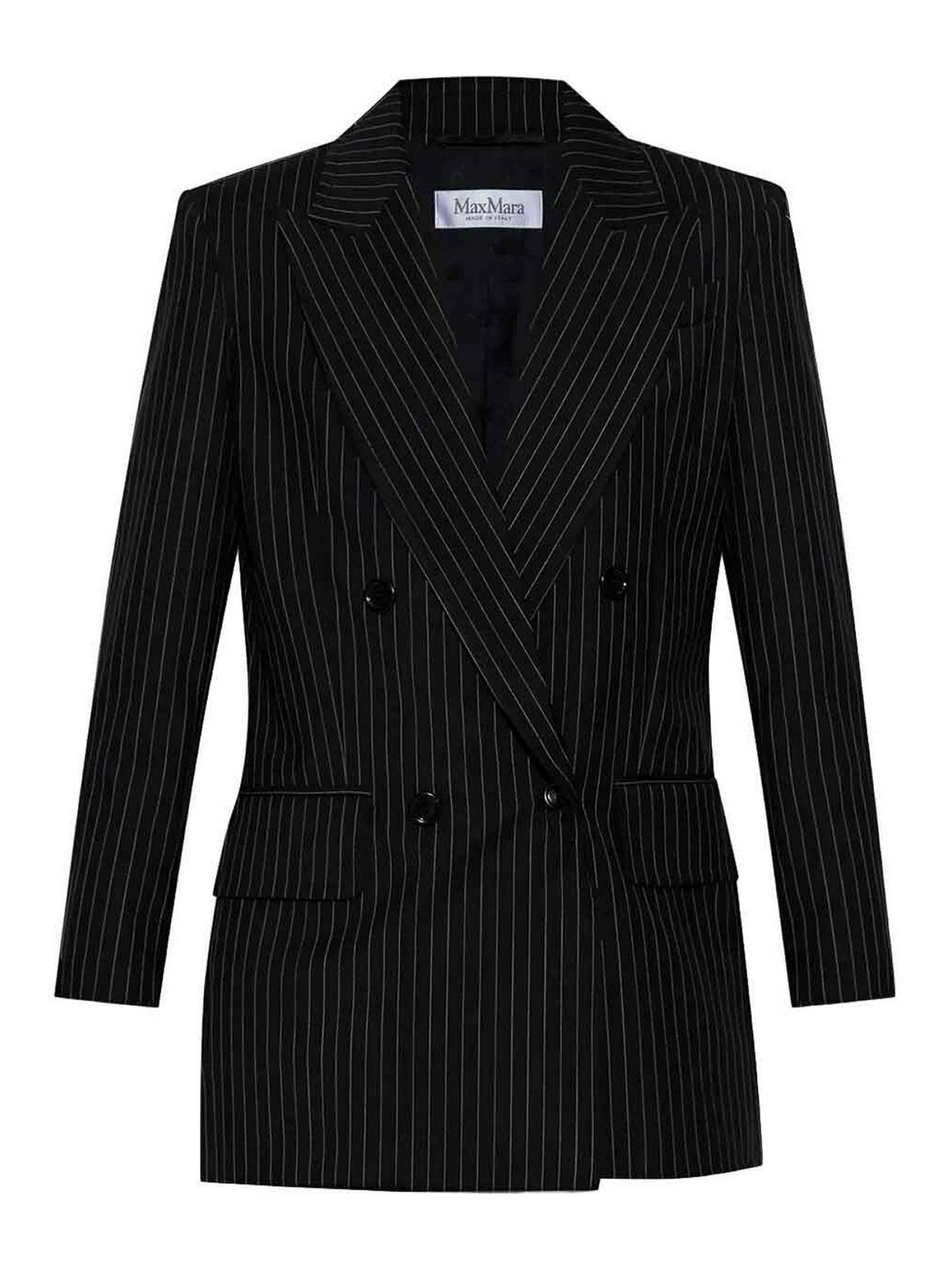 Black and white striped pattern, pointed lapels, double breasted, padded shoulders, side pockets