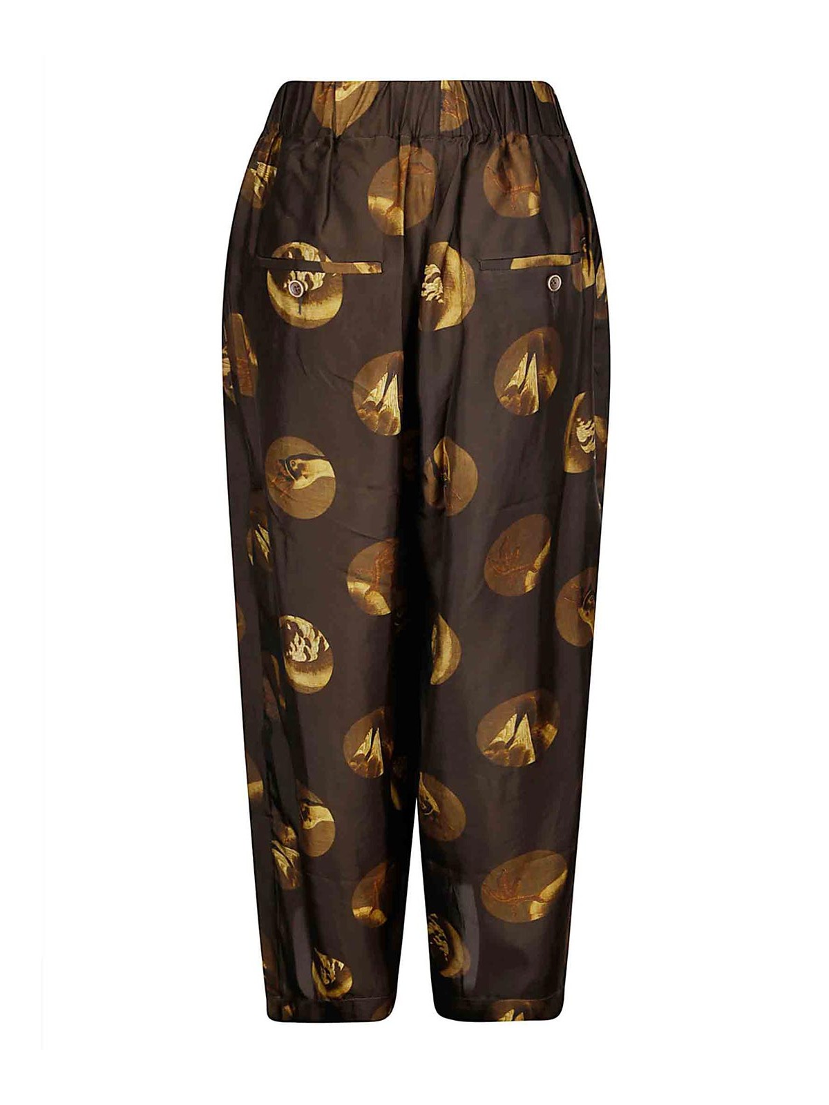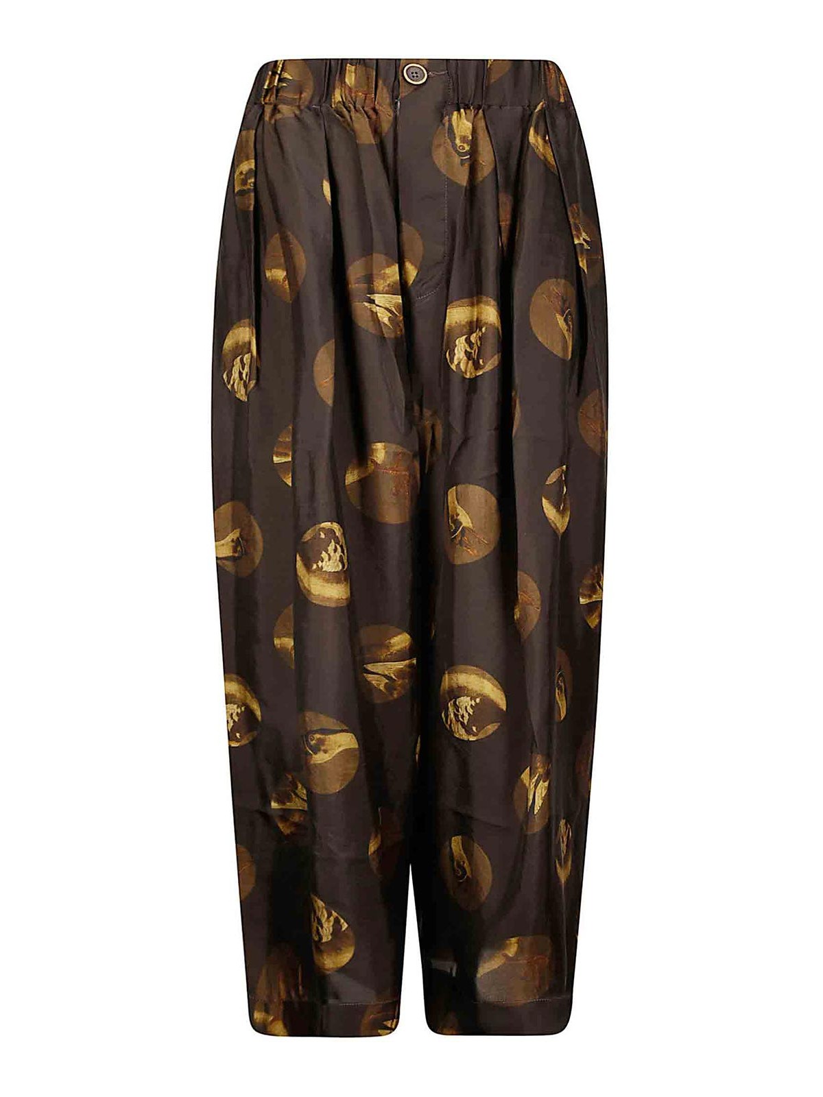 Wide leg trousers, elastic waist with button, large polka dot print with drawings.