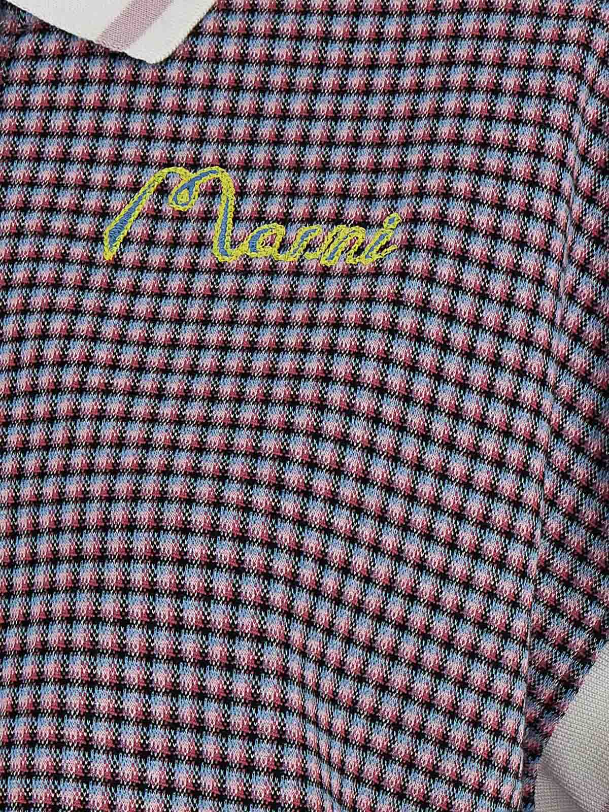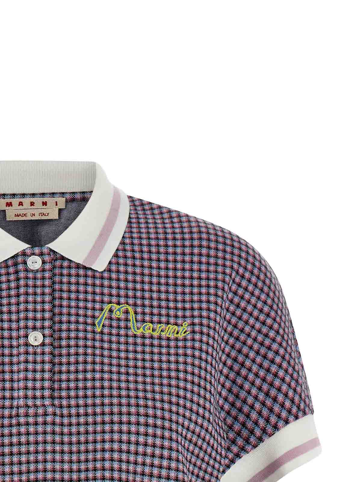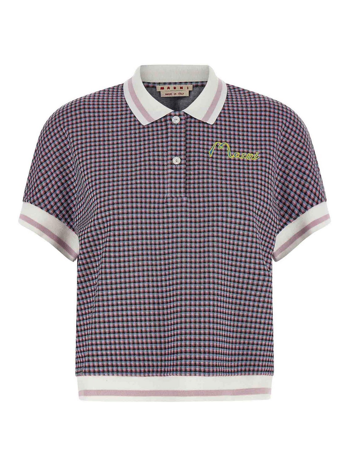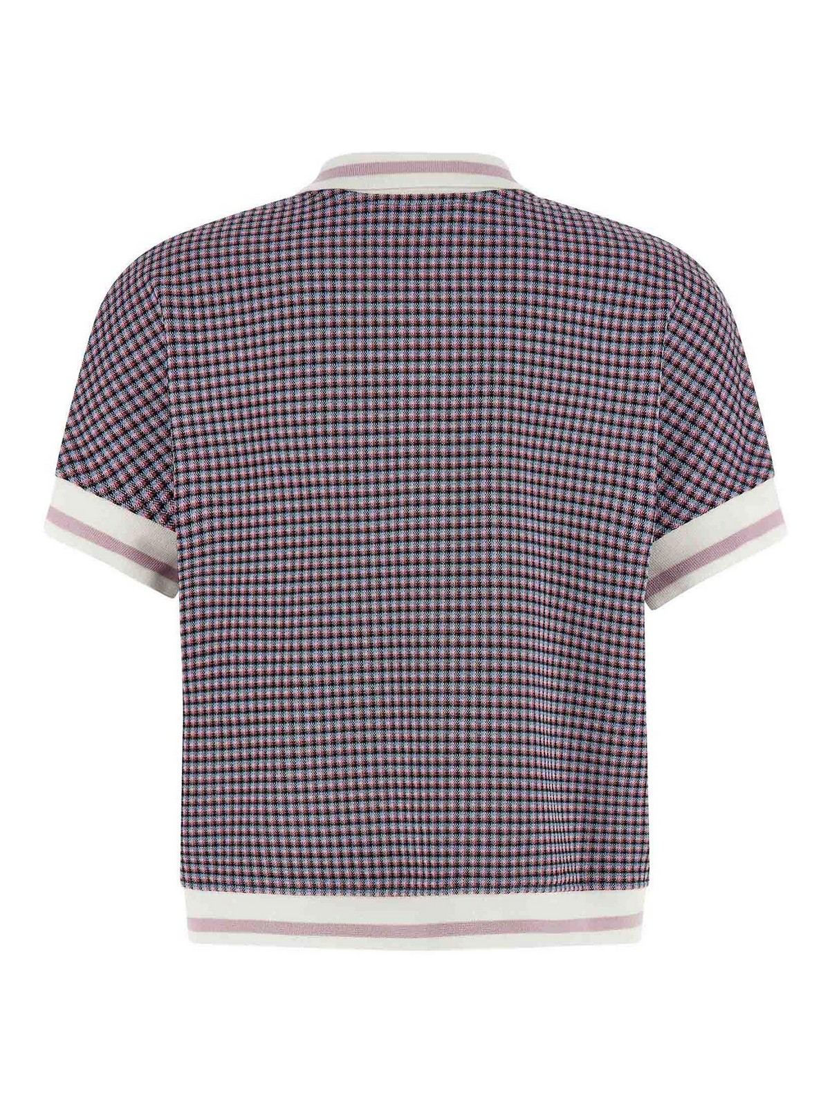 Check patterned viscose blend polo shirt with contrasting ribbed stretch knit details, slightly cropped style, collar and buttons, short sleeves with cuffs, and band on the hem.