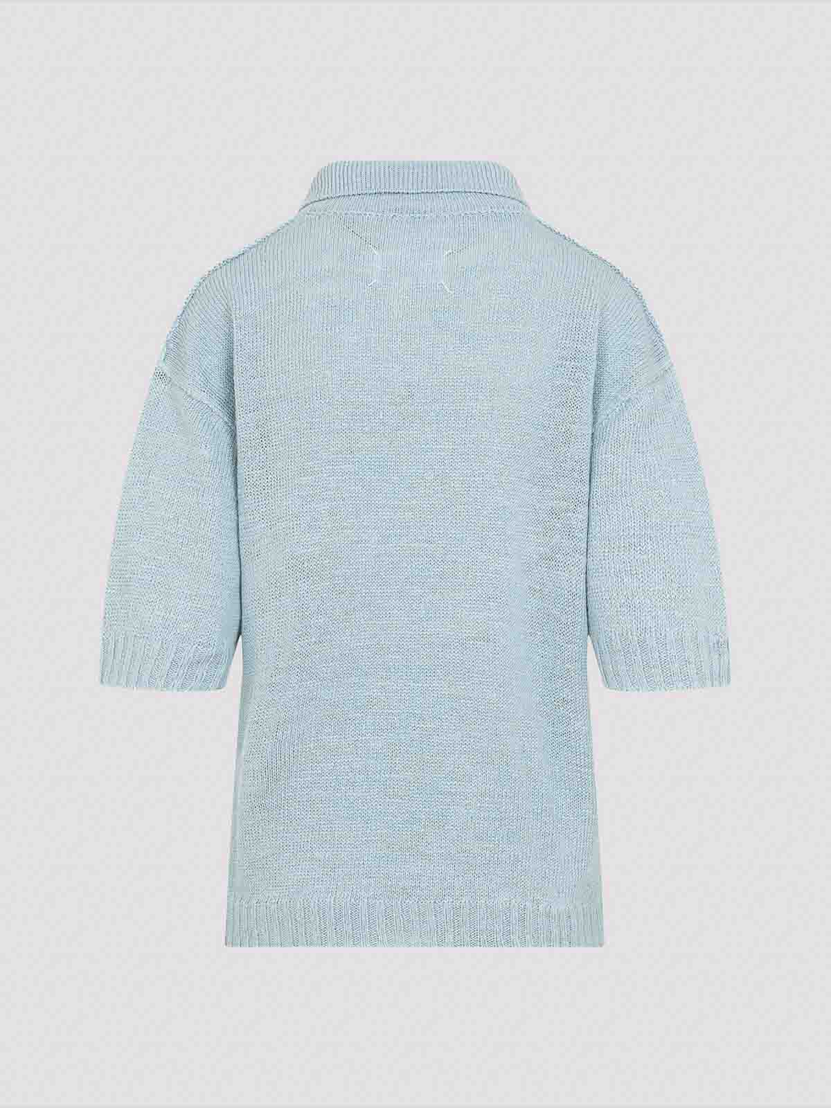 Maison margiela light blue true hemp polo shirt. pure light blue true hemp polo shirt, classic polo collar, back signature white stitching, dropped shoulders, short sleeves, ribbed trims and hem, straight hem.