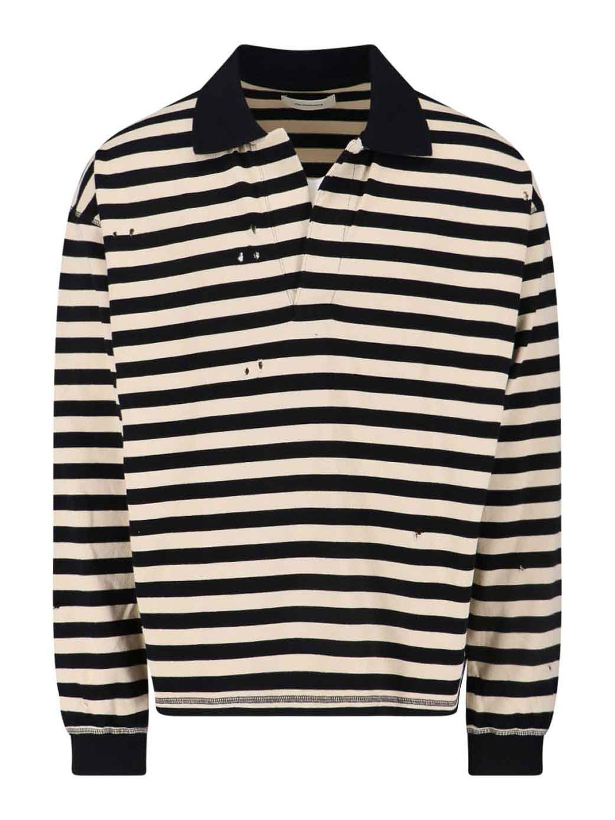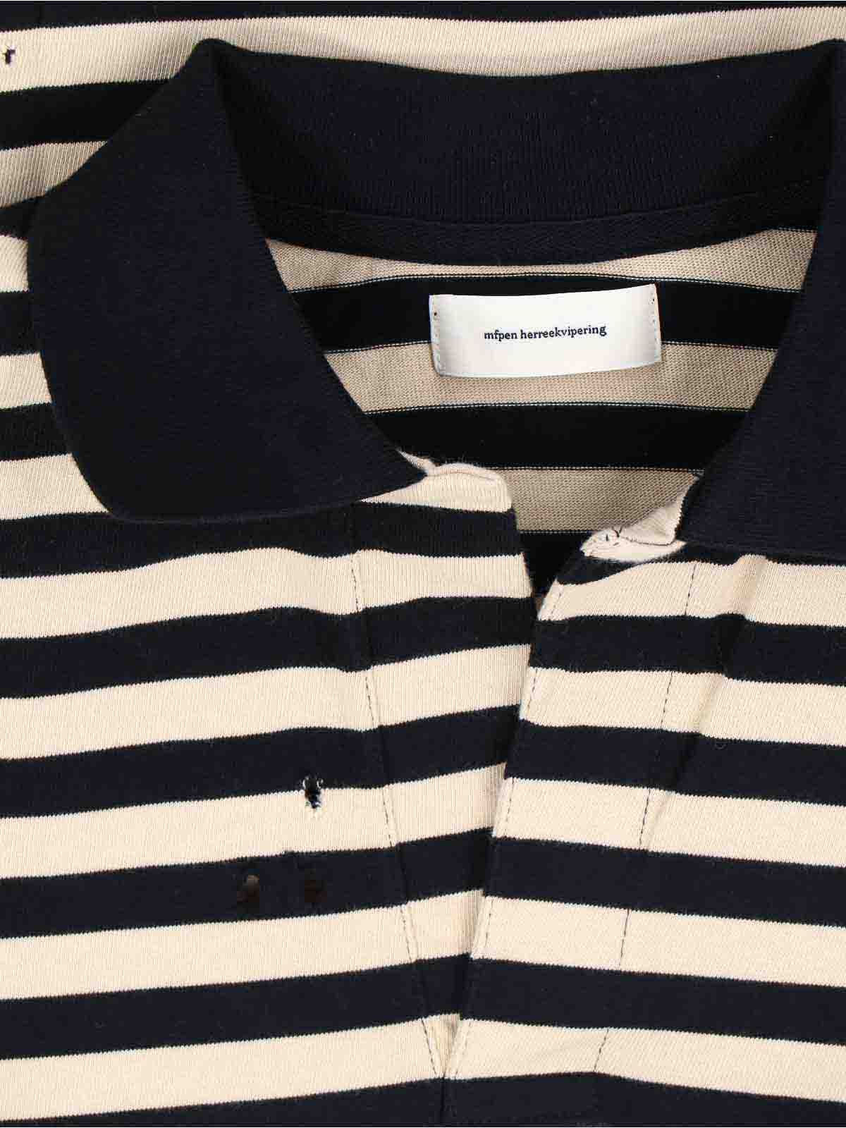 mfpen fractured polo shirt, in black and cream organic cotton, all-over destroyed details, classic collar, dropped shoulders, v-neck, ribbed finishes, straight hem.