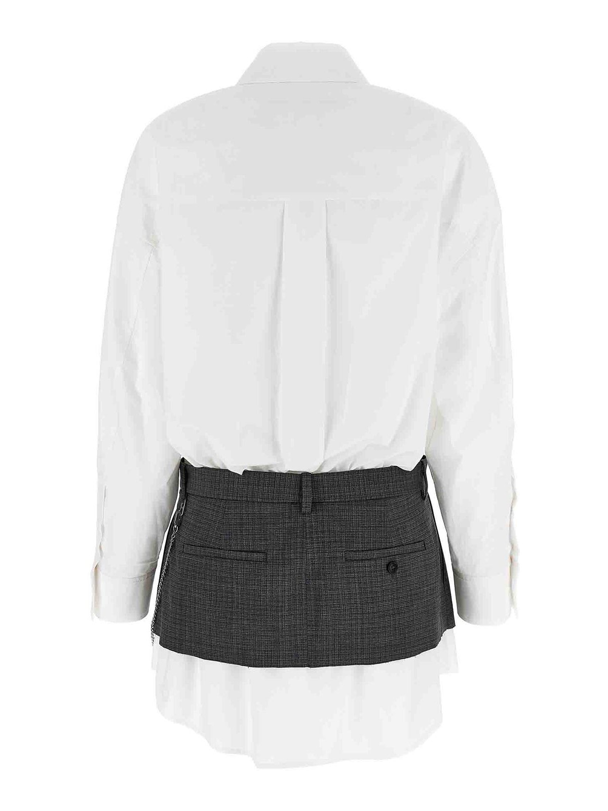 pre-styled shirt dress w chain' cotton dress, oversized shirt model with overlapping skirt, shirt with front button closure, breast pocket with tone-on-tone embroidered logo, long sleeves with cuffs and dropped shoulder and mini skirt in flounced melange wool, zip hook and front button closure, pockets, chain with removable charm.