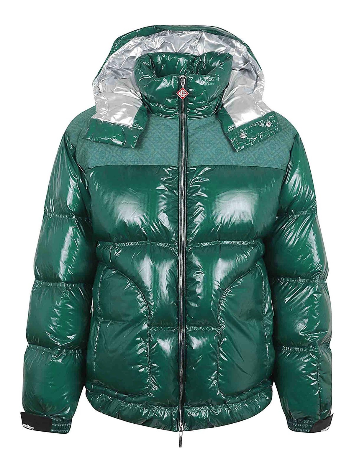Down-filled ripstop nylon down jacket with a Casablanca jacquard panel, featuring a hood with a CC logo toggle and drawstring, a high collar, a zip closure with a diamond logo tab, front zip pockets, adjustable logo cuffs, an elasticated hem and cuffs, and a relaxed fit. Featuring a contrasting monogram on the shoulders.