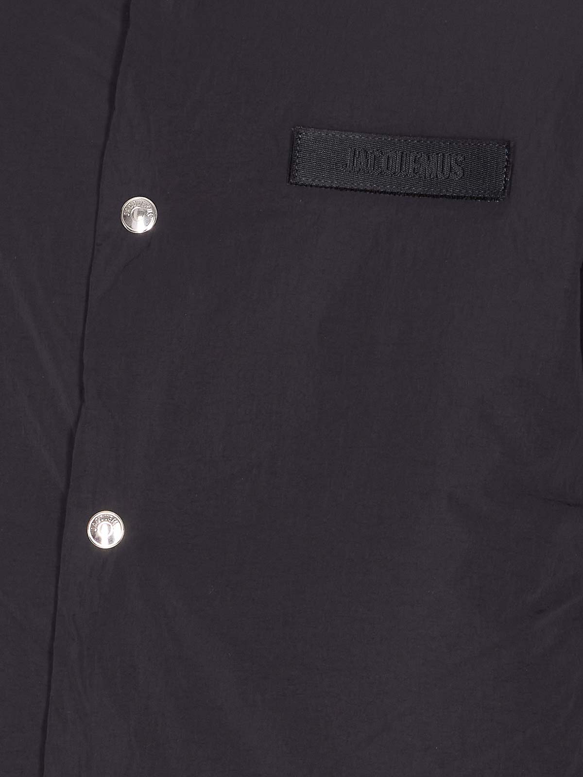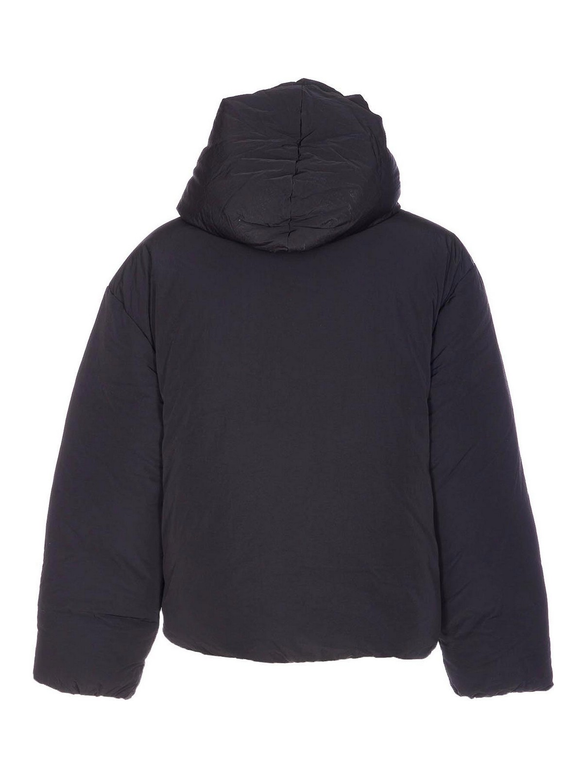 Jacquemus black logo down jacket with frontal zip and buttons closure, hood detail, velcro logo detail on the front, long sleeves, padded