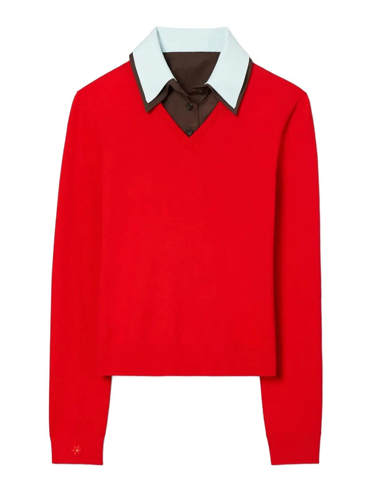 V-neck model with a removable collar, made of ultra-soft merino wool with a slight stretch, removable collar with button closure, and floral embroidery on the right cuff. composition 80% wool, 17% polyamide, 3% elastane