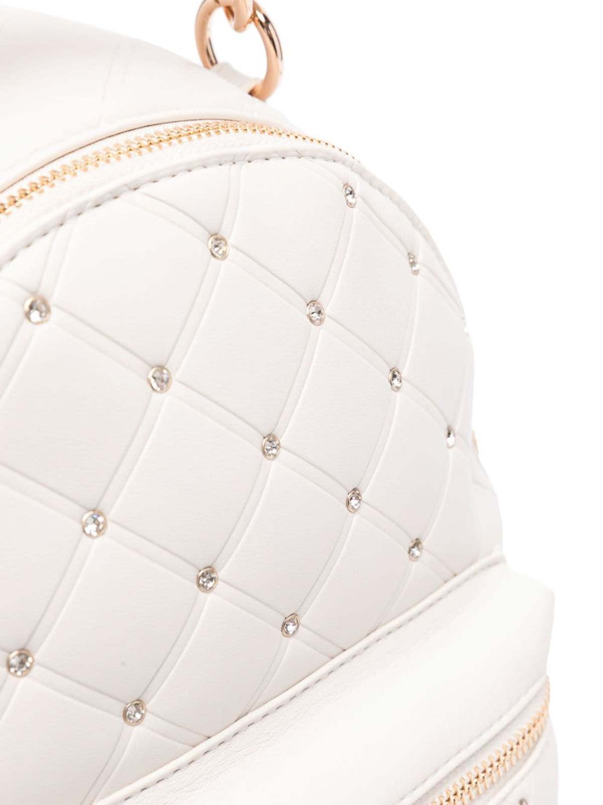 Quilted backpack, white, single circular top, two adjustable shoulder straps, hardware, engraved logo, embellished with, logo writing, patch with logo, pocket with zip, top zip