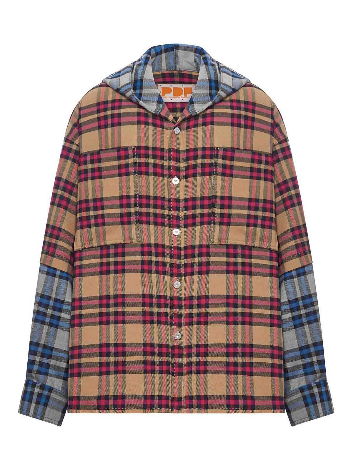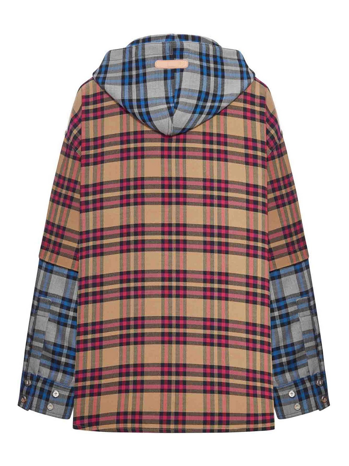 Hood- button, two patch pockets- contrasting double, tartan pattern- long sleeves- buttoned cuffs- straight hem- color beige/blue