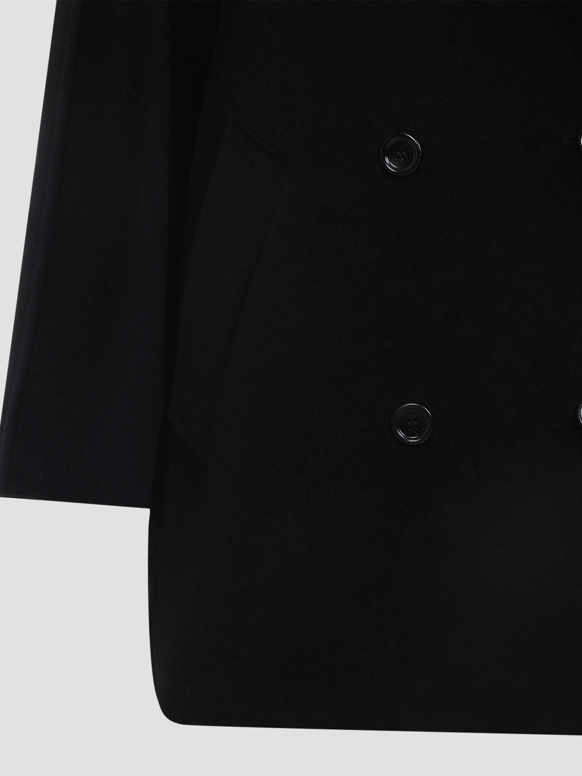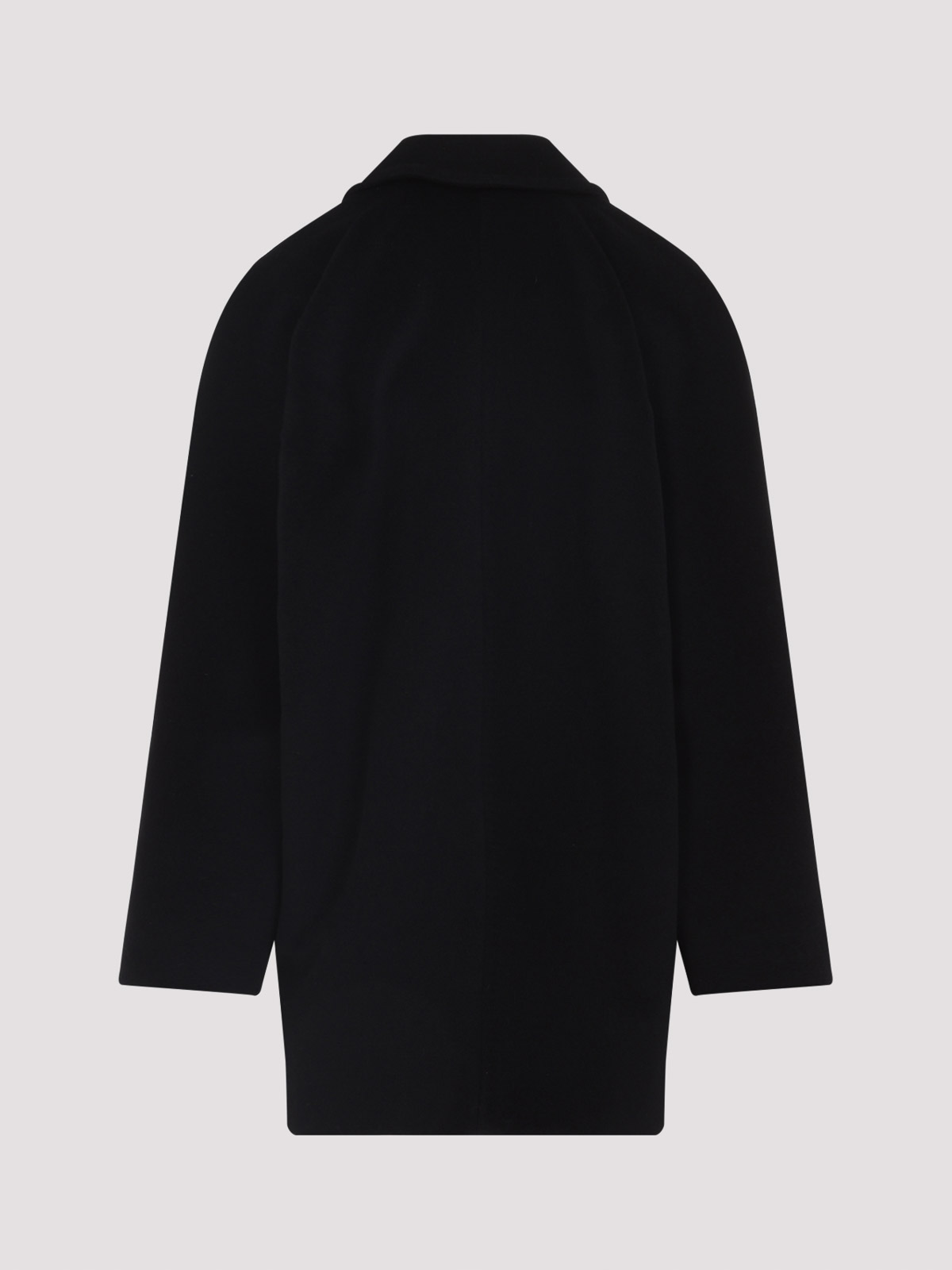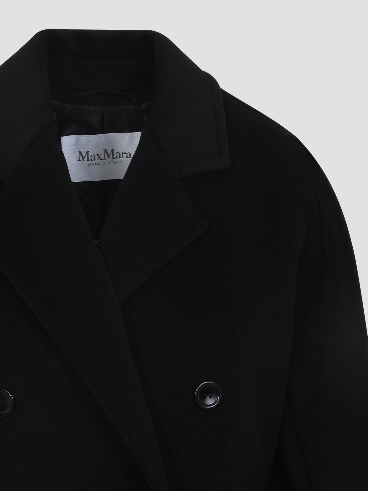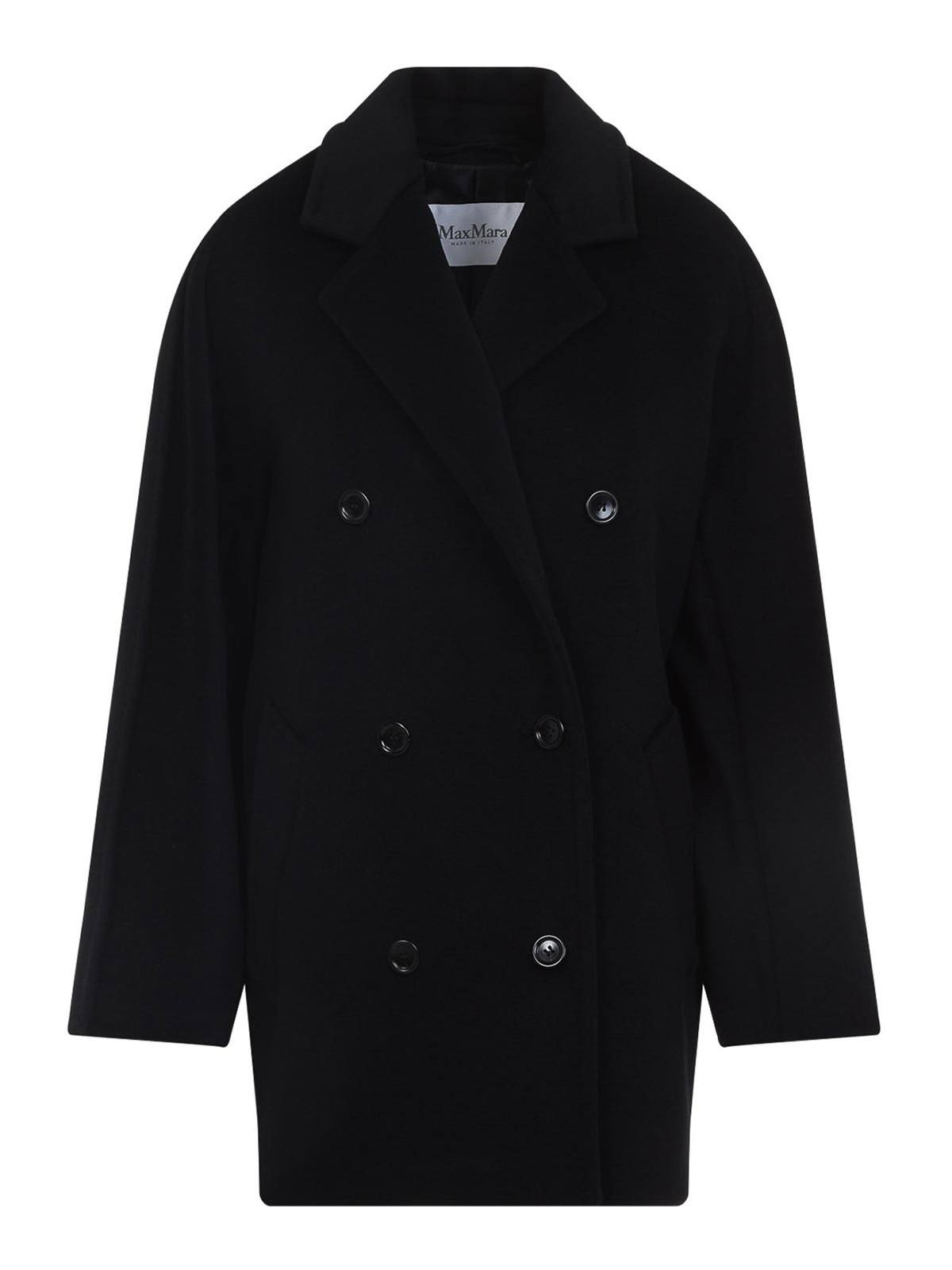 Max mara black wool rebus coat. crafted in wool and cashmere blend. notched collar, front buttoned fastening, double-breasted design, side pockets, long sleeves, buttoned cuffs, straight hem, fully lining.