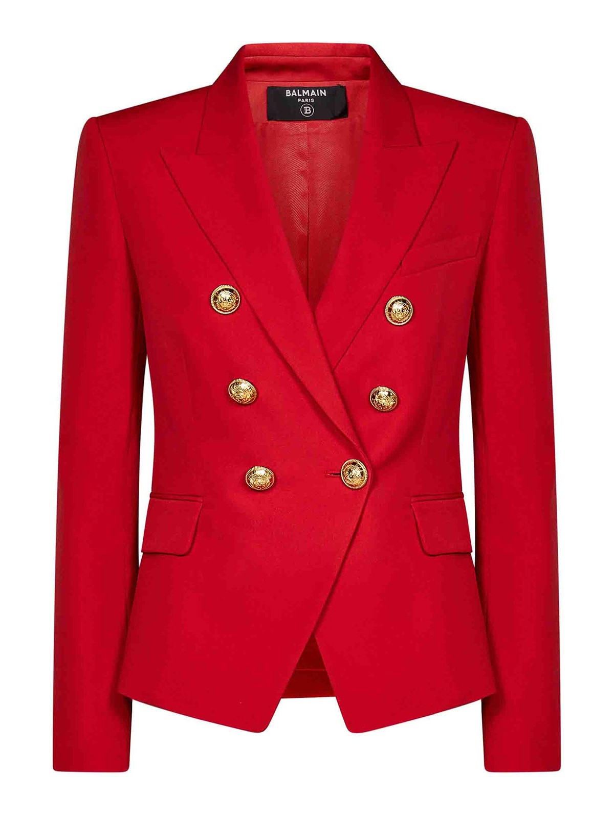 Double-breasted six-button five of which are decorative peak lapel long sleeves structured shoulders five-button cuffs welt waist pockets with flap chest pocket fitted waist golden ''coin'' buttons twill fitted fit red in photo corresponds to a fr