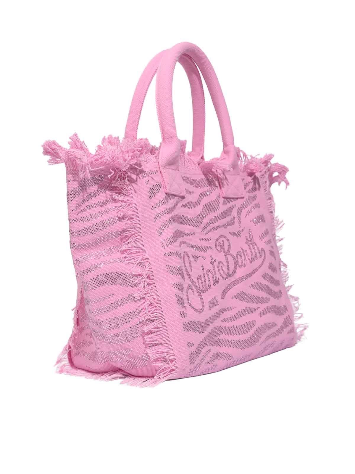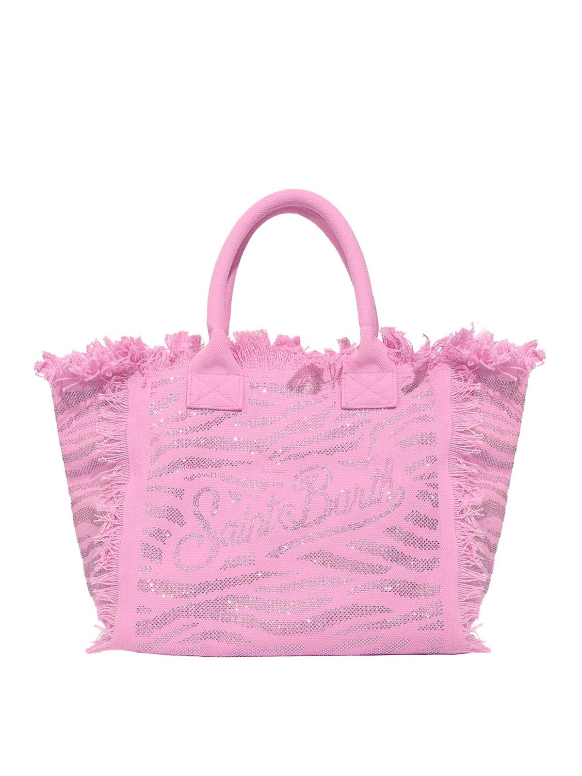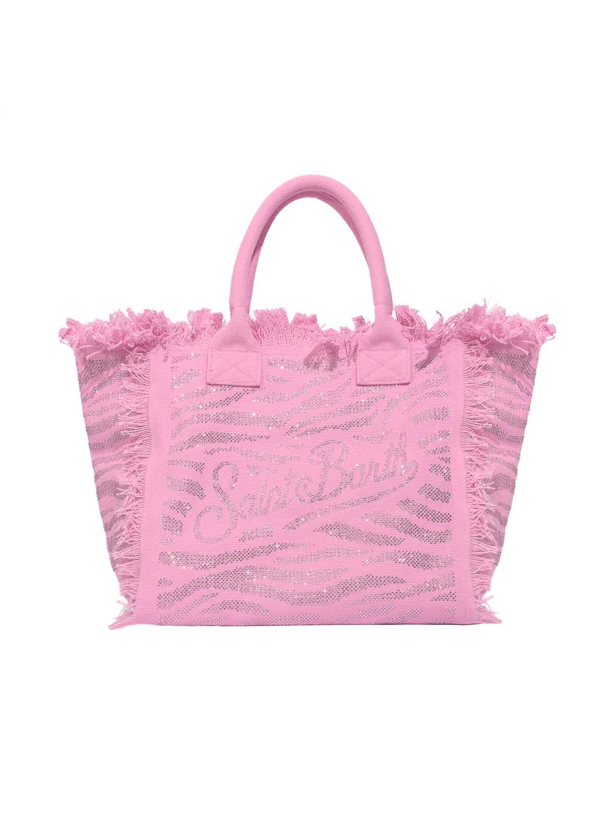 Zebra cotton canvas bag with rhinestones, mc2 saint barth, regular vanity model, material: cotton canvas, pattern: zebra print with rhinestones, closure: top with zip, handles/shoulder strap: double handles, pockets: internal storage, details: tone-on-tone saint barth logo, rhinestone applications, fringed edges, lined: no, capacity: medium, fit/carry: by hand