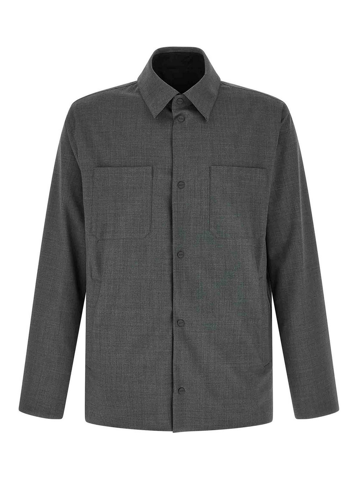Reversible overshirt in technical wool and nylon fabric, classic collar, front closure with snap buttons, patch pockets and oblique side pockets, long sleeves.