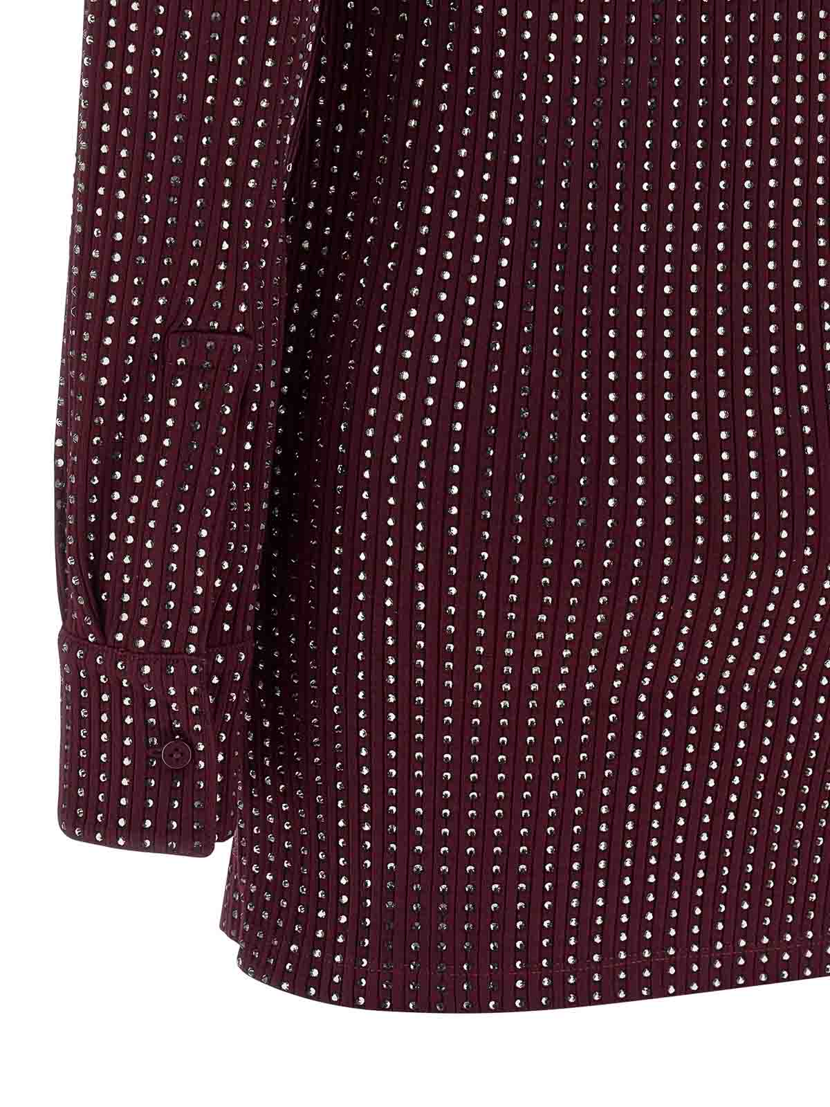Ribbed cotton mini dress with all-over rhinestone appliqu, chemisier model, front hook closure with cut-out teardrop detail, long cuffed sleeves, back logo patch.
