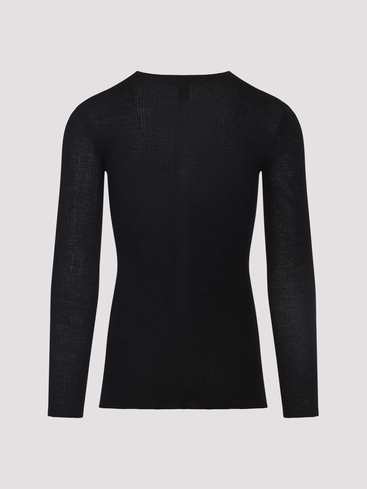 Rick owens black wool ribbed round neck pullover. pure black wool pullover, round neck, long sleeves, straight hem, tonal stitching, ribbed all-over.