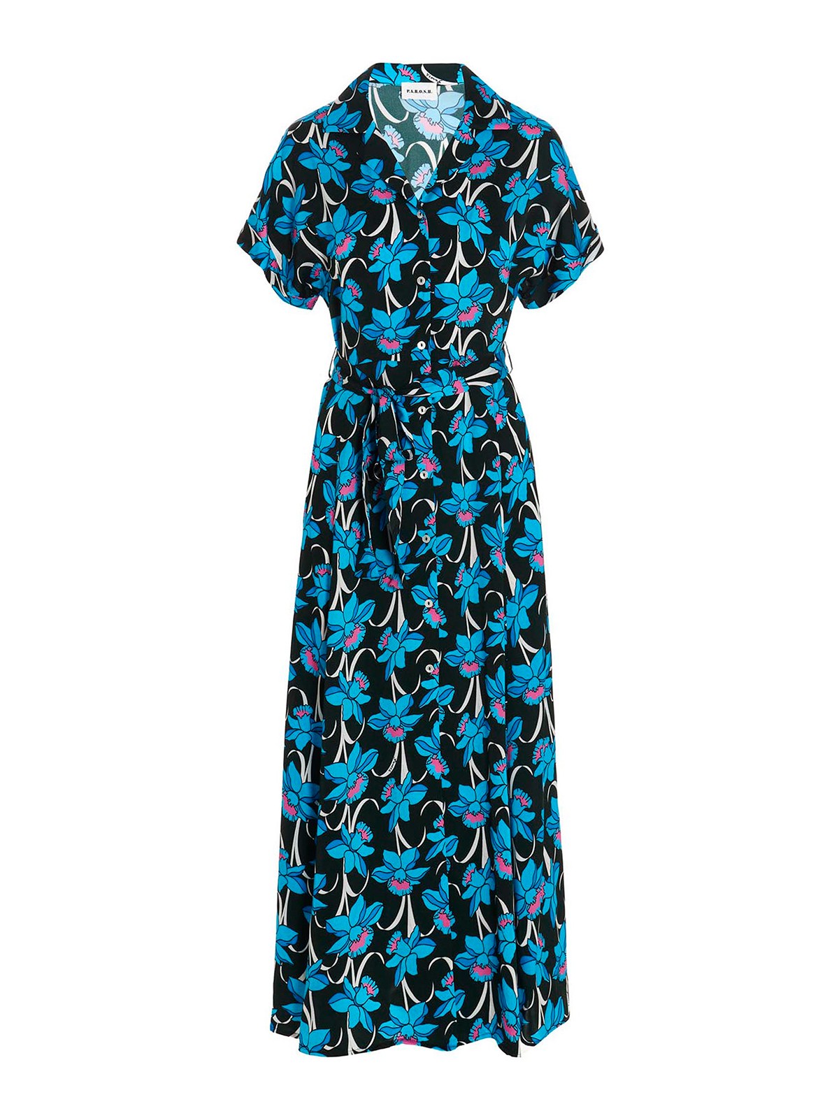 ribes' viscose dress with an all over floral print short sleeves a front button closure and a belt at the waist