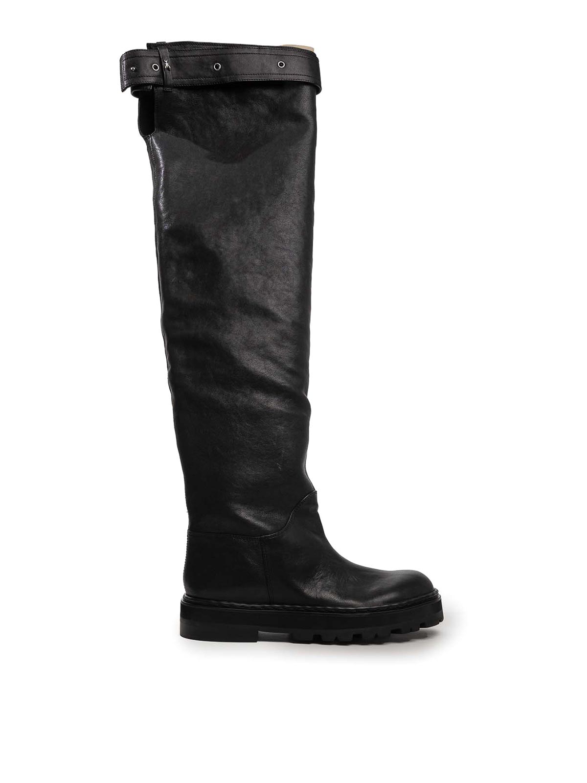 Leather over, the, knee boots patrizia pepe type boots black smooth with a natural effect featuring an over, the, knee fit and an adjustable buckle strap on the top edge side zip black with a non, slip tread and flat with a raised