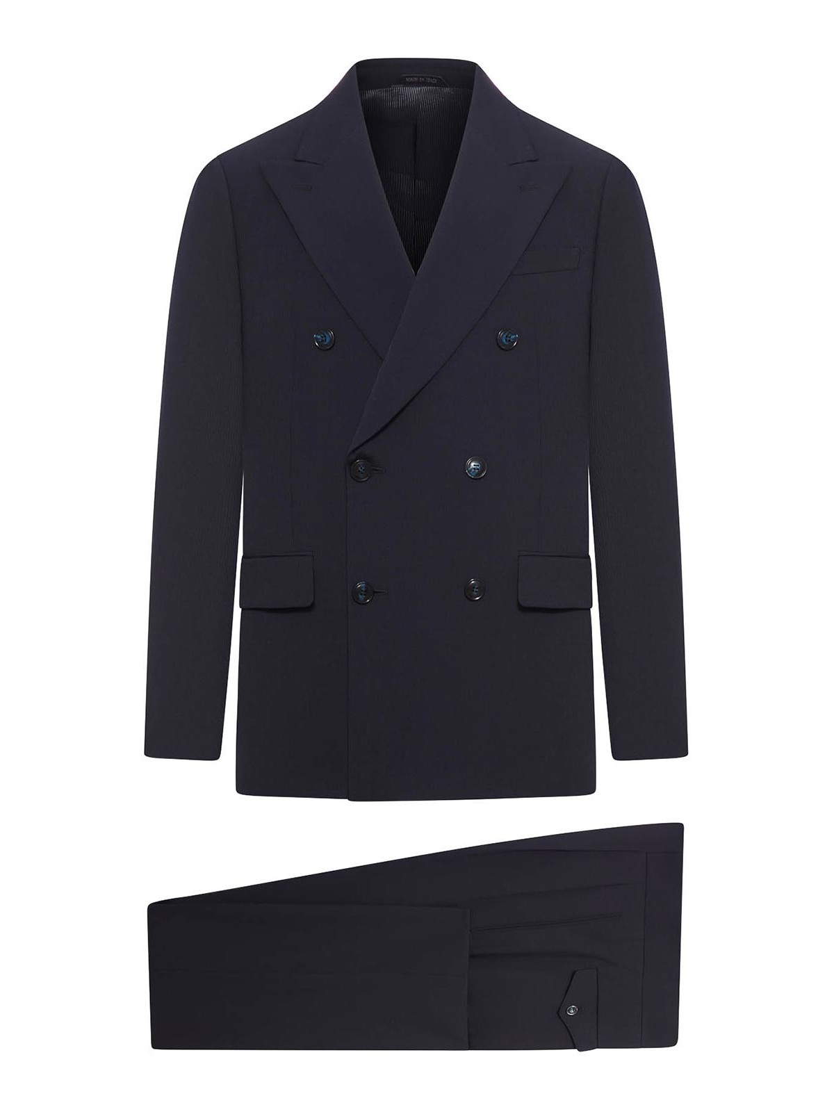 Royal line suit- double-breasted jacket- six-button, reinforced shoulder strap with rollino- peak lapels- two pockets with flap- breast pocket- two side slits on the back- two-pleat trousers- zip and button, two side welt pockets- two back pockets with flap and button- navy