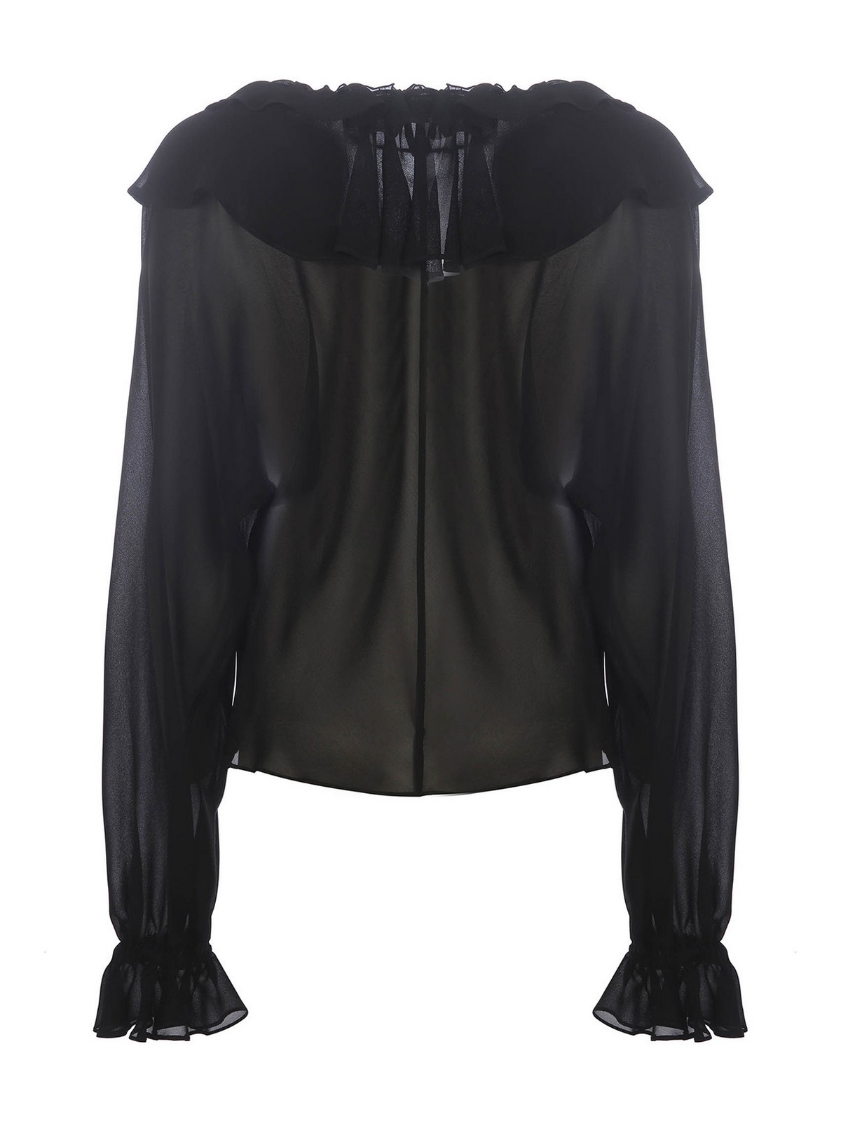 Shirt philosophy in black-coloured viscose, v-neckline, ruffle detail on the neckline, long sleeves, elasticated sleeve bottom with flounce, front closure to tie.