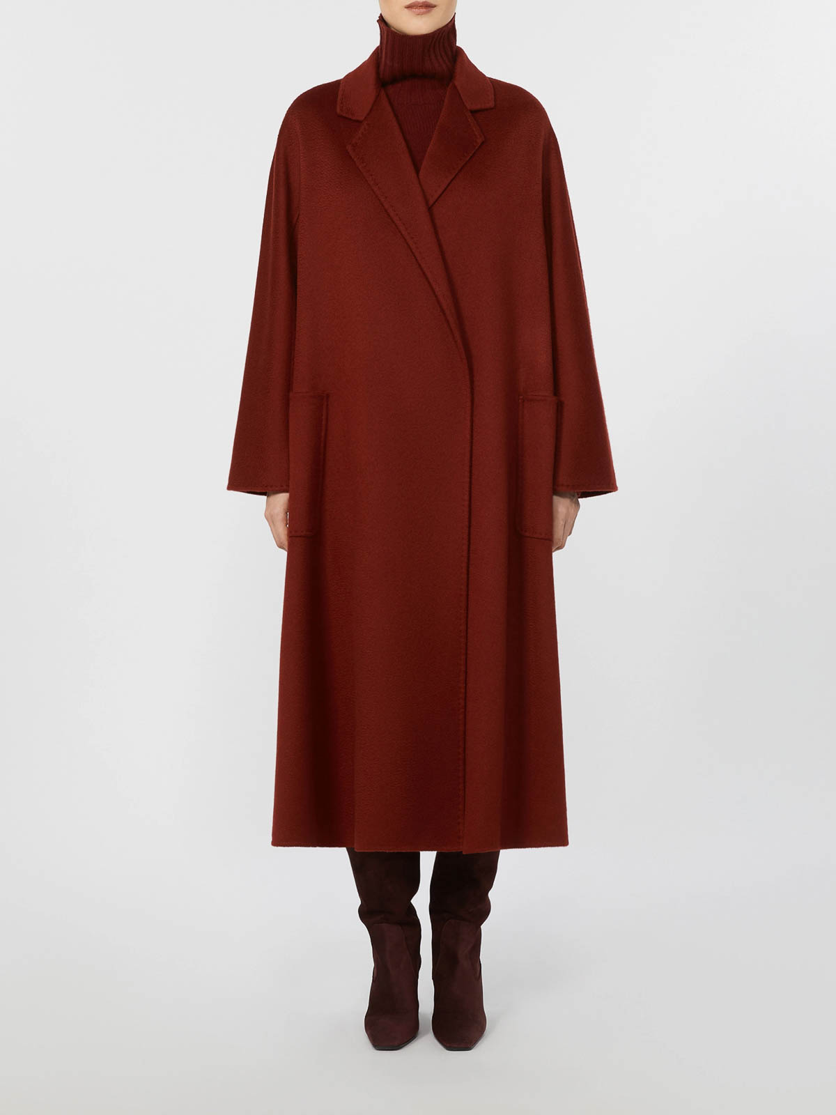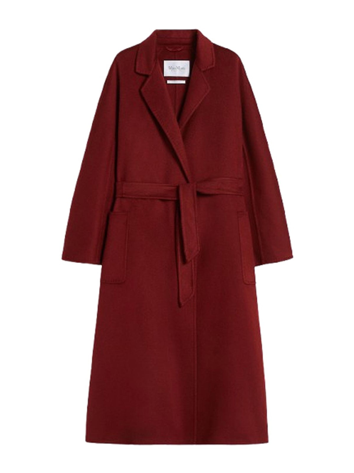 Made of double sable cashmere drap, hand-sewn finished with a tailored tack lapel collar kimono sleeves at the front, raglan at the back patch pockets matching belt length 120 cm / 4.7 inches raspberry color