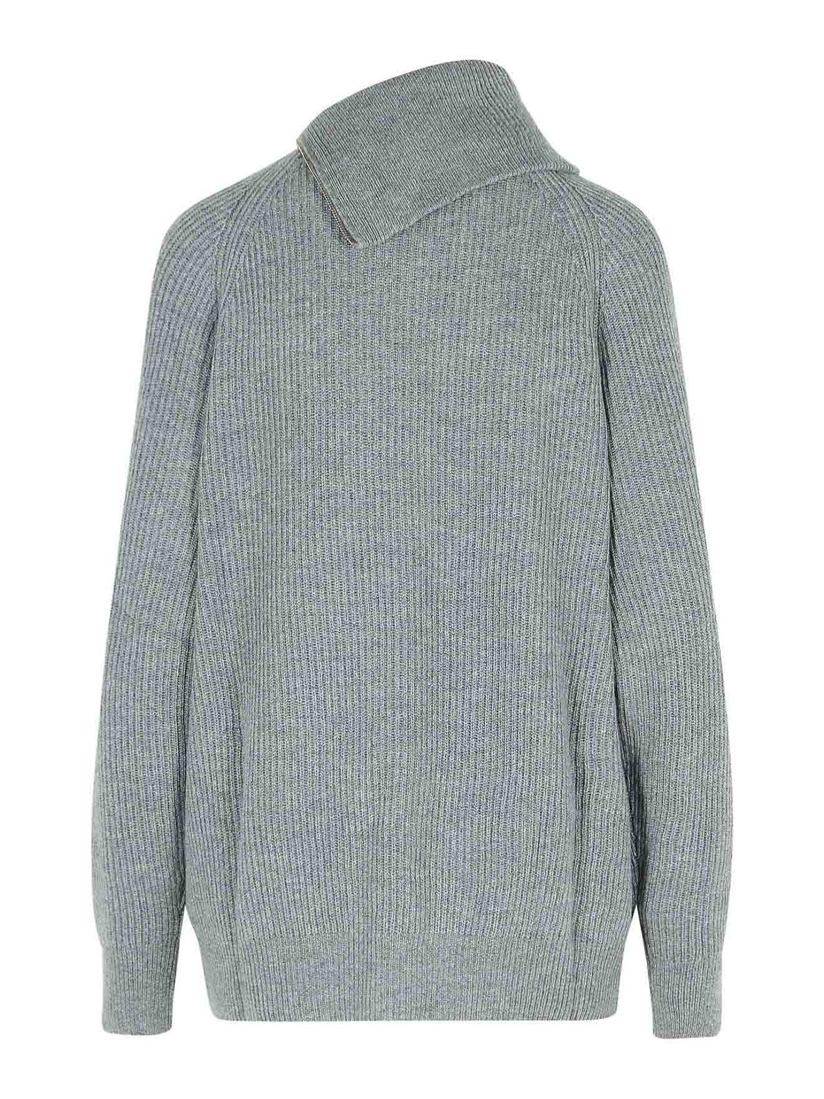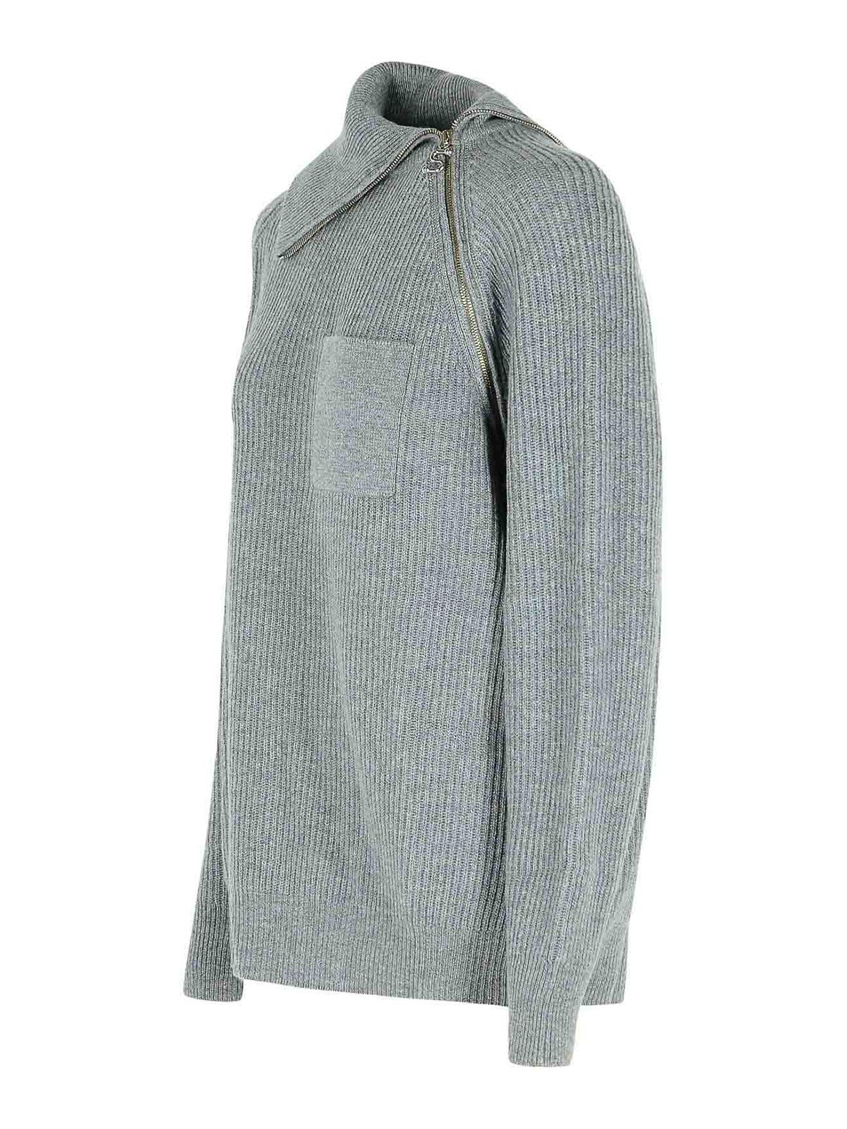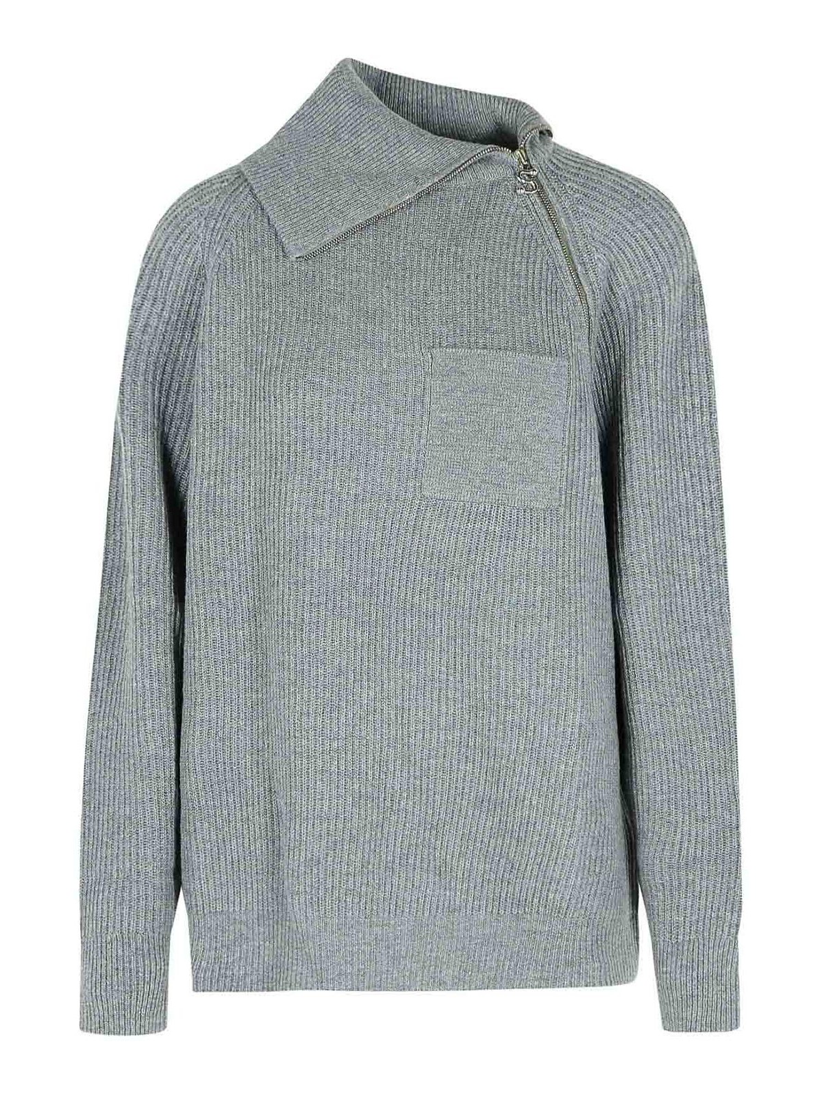 Wool and yarn sweater loose fit high neck with contrasting interior diagonal zip opening on the neck and left shoulder chest pocket raglan sleeves loose fit