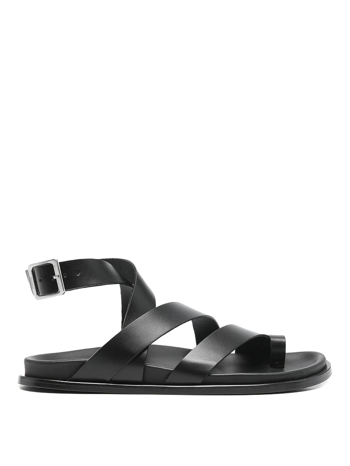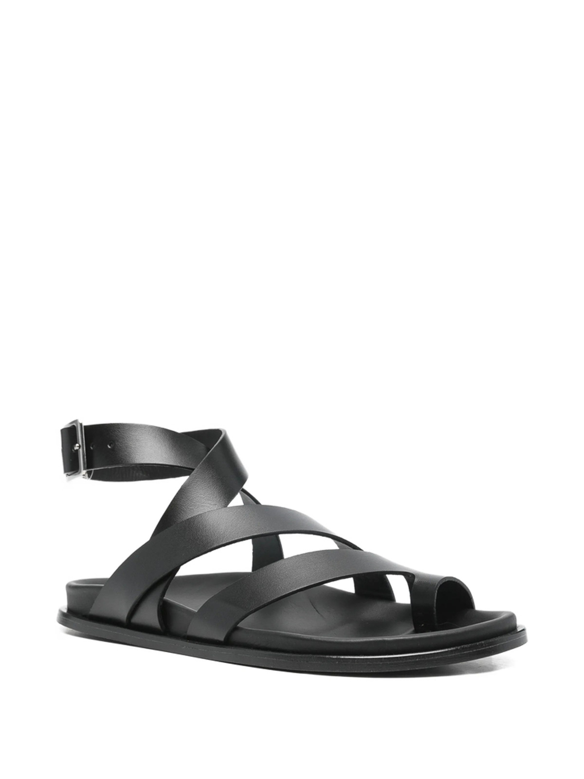 Black crossover strap ankle strap buckle fastening flat sole toe post