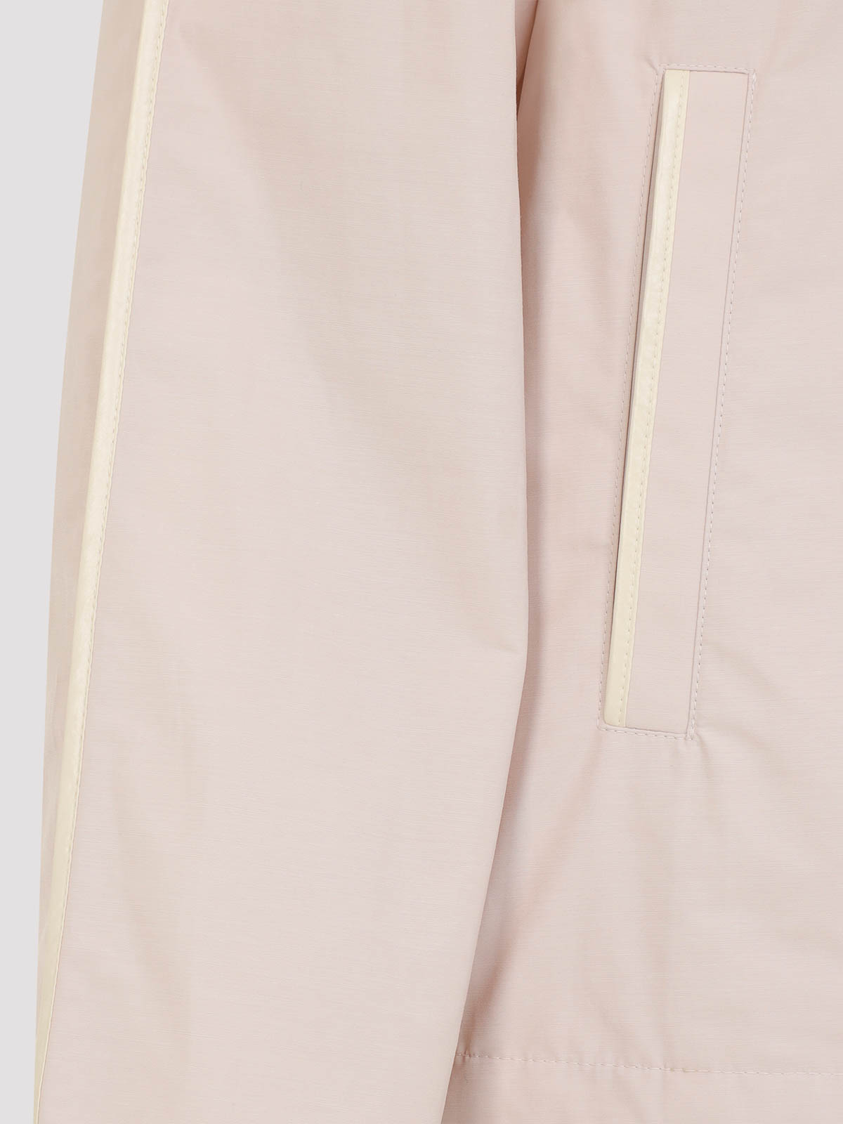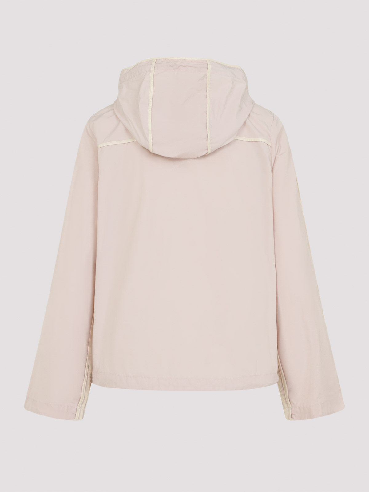 Moncler sarracenia pink polyester jacket. crafted from pink tech poplin, featuring ivory trim, a hood with drawstring, front two-way zip fastening, a logo patch on the chest, two front pockets, and a drawstring at the hem.