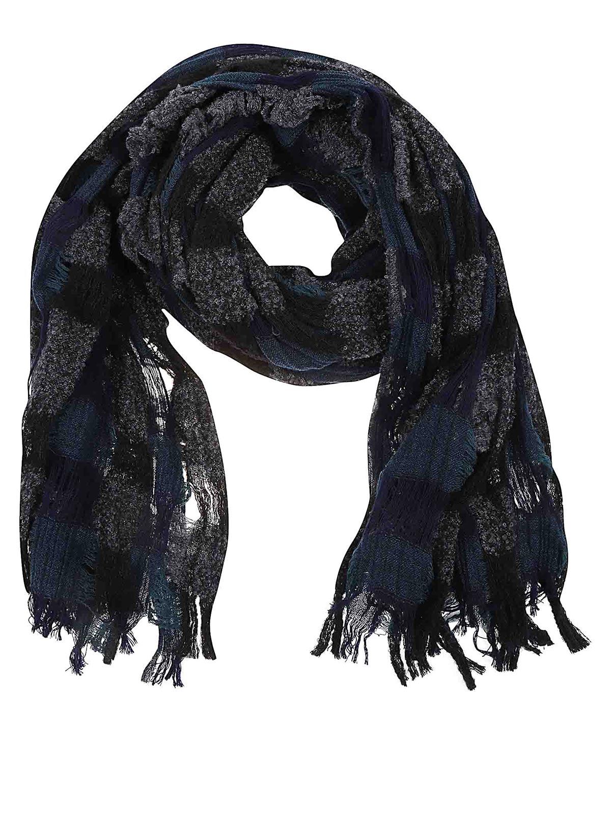 Black perforated checked patterned wool blend scarf, fringed at the bottom.