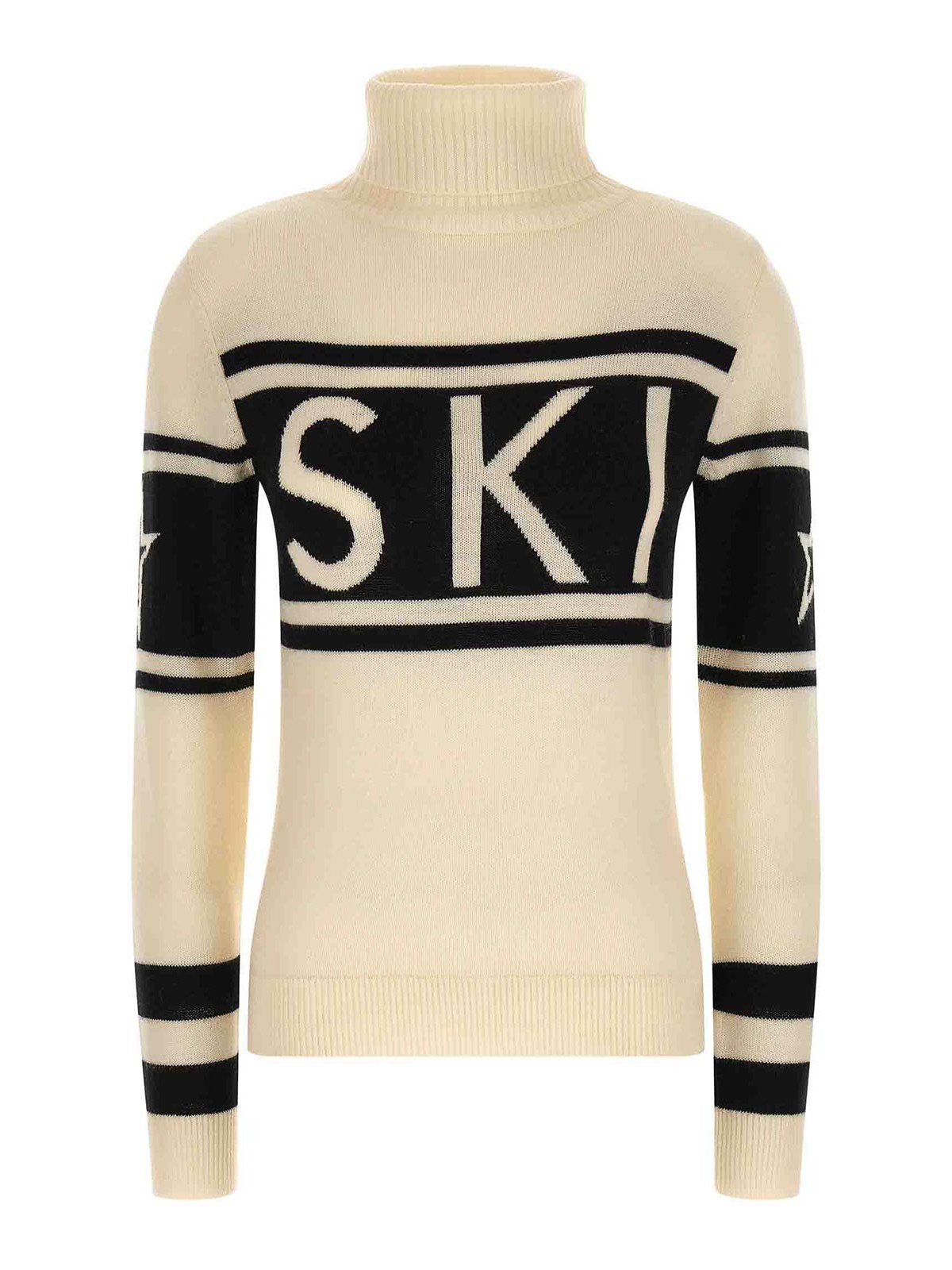Schild' wool sweater with front jacquard pattern, turned-up high neck, long cuffed sleeves.