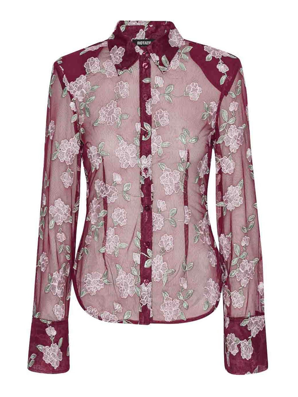A sophisticated, semi-sheer burgundy shirt by rotate, embellished with sophisticated floral embroidery. the elegant design features long sleeves and a front button closure for a feminine and bold look, perfect for both casual and evening wear, rotate, shirt, burgundy, semi-sheer fabric, floral embroidery, long sleeves, front buttons, sophisticated and bold look