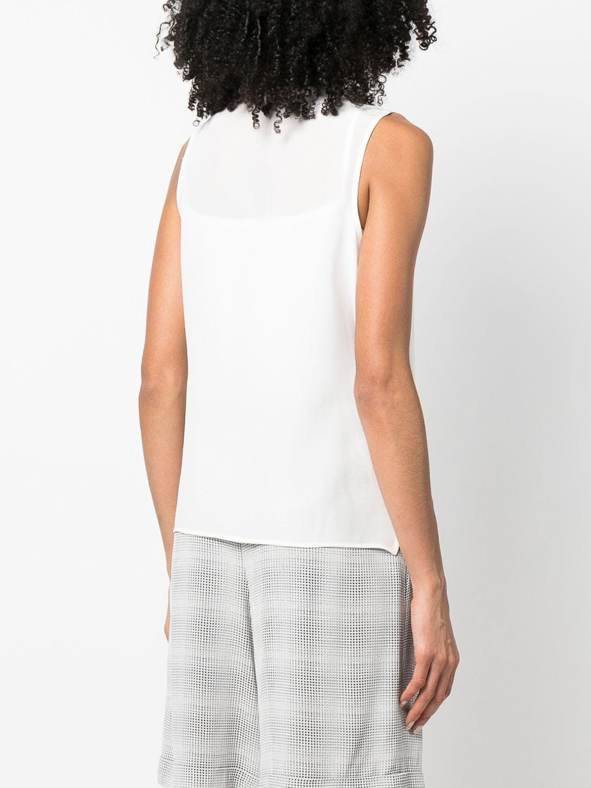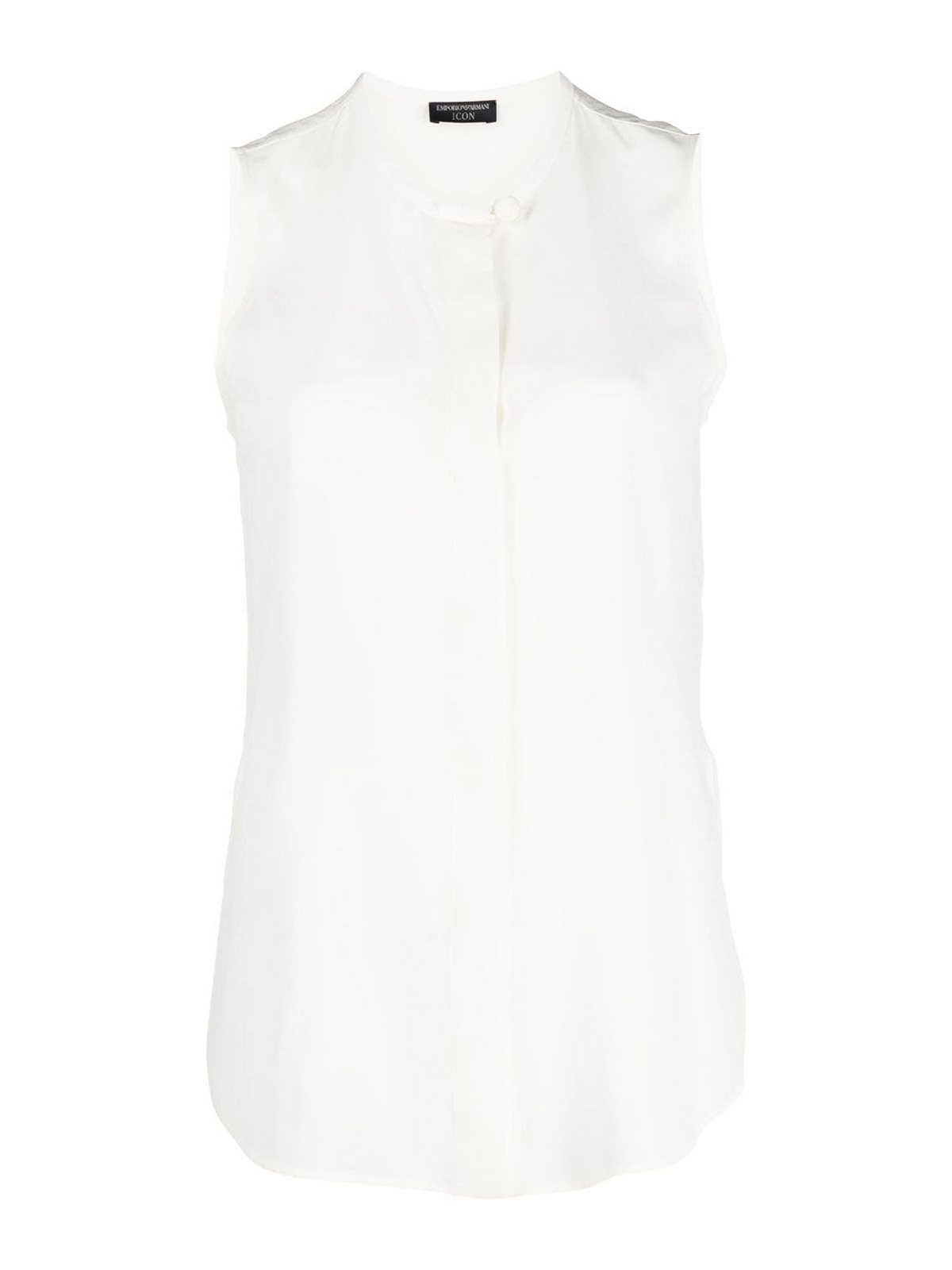 Semi-sheer silk vest top from emporio armani featuring semi-sheer construction, round neck, sleeveless, curved hem, white and silk.