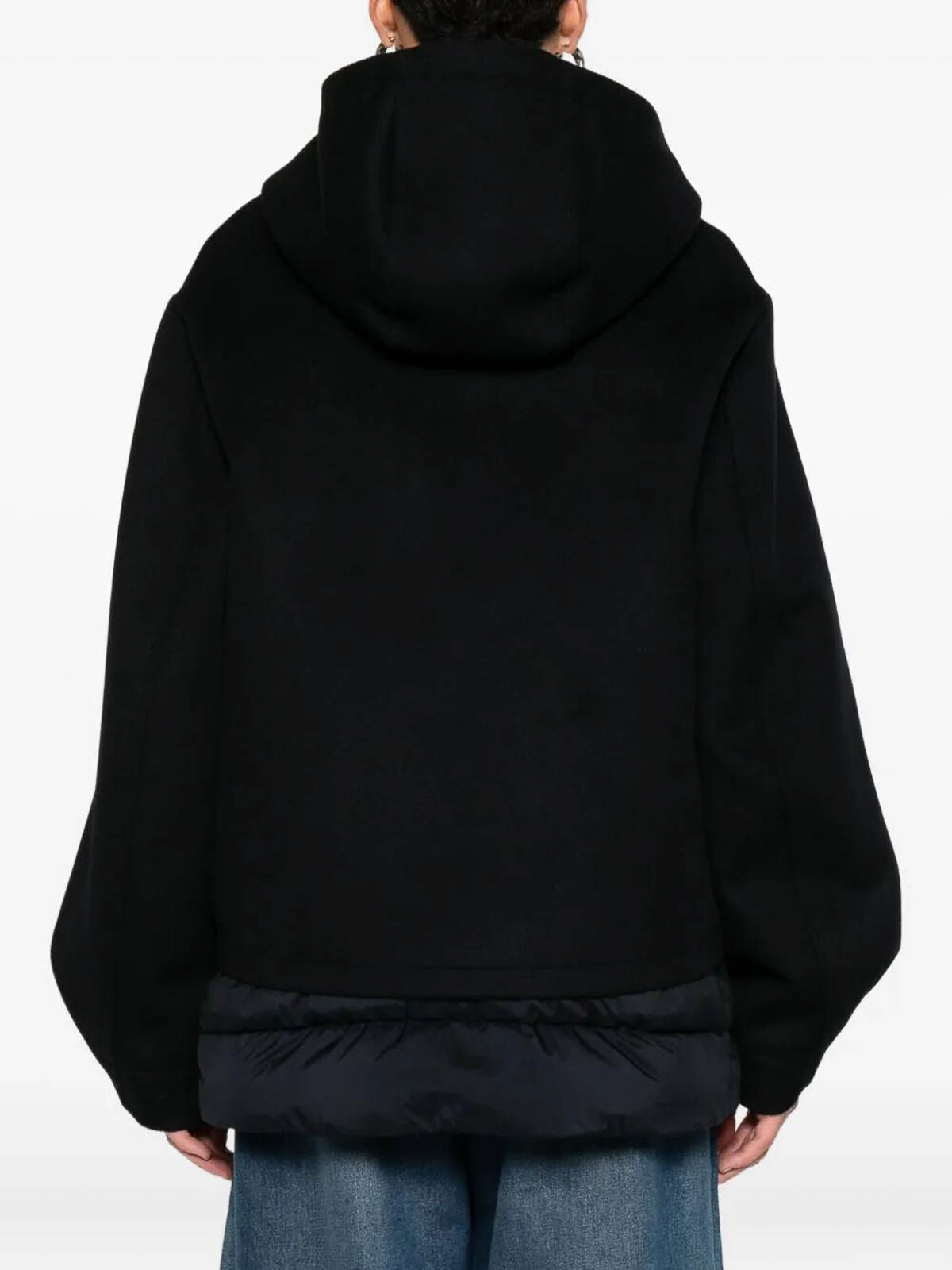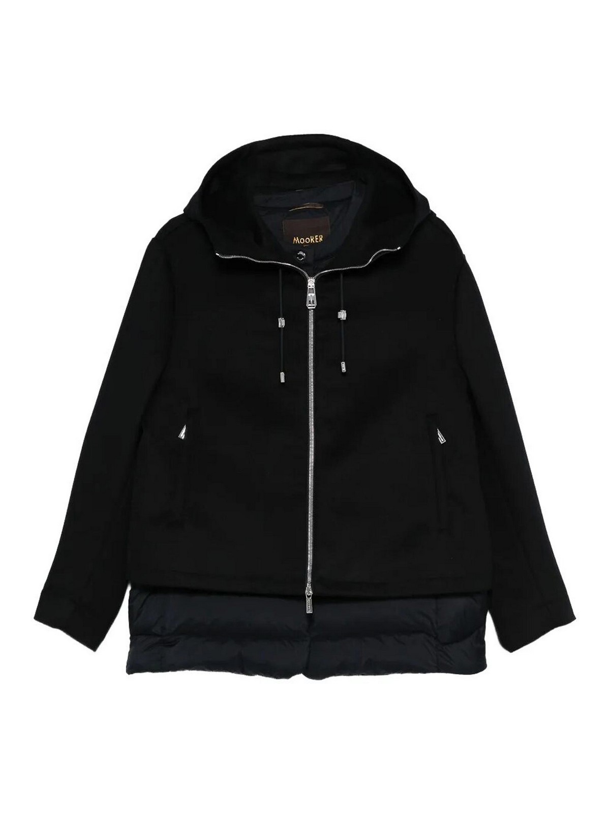 Black, down padding in the lower part, front zip closure, hood with drawstring, welt pockets