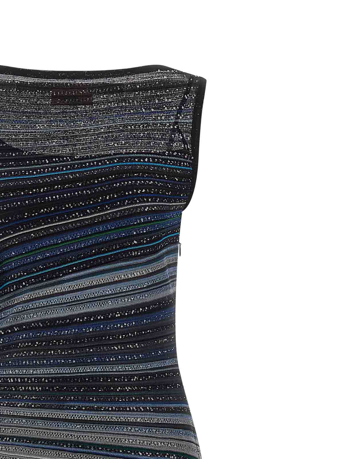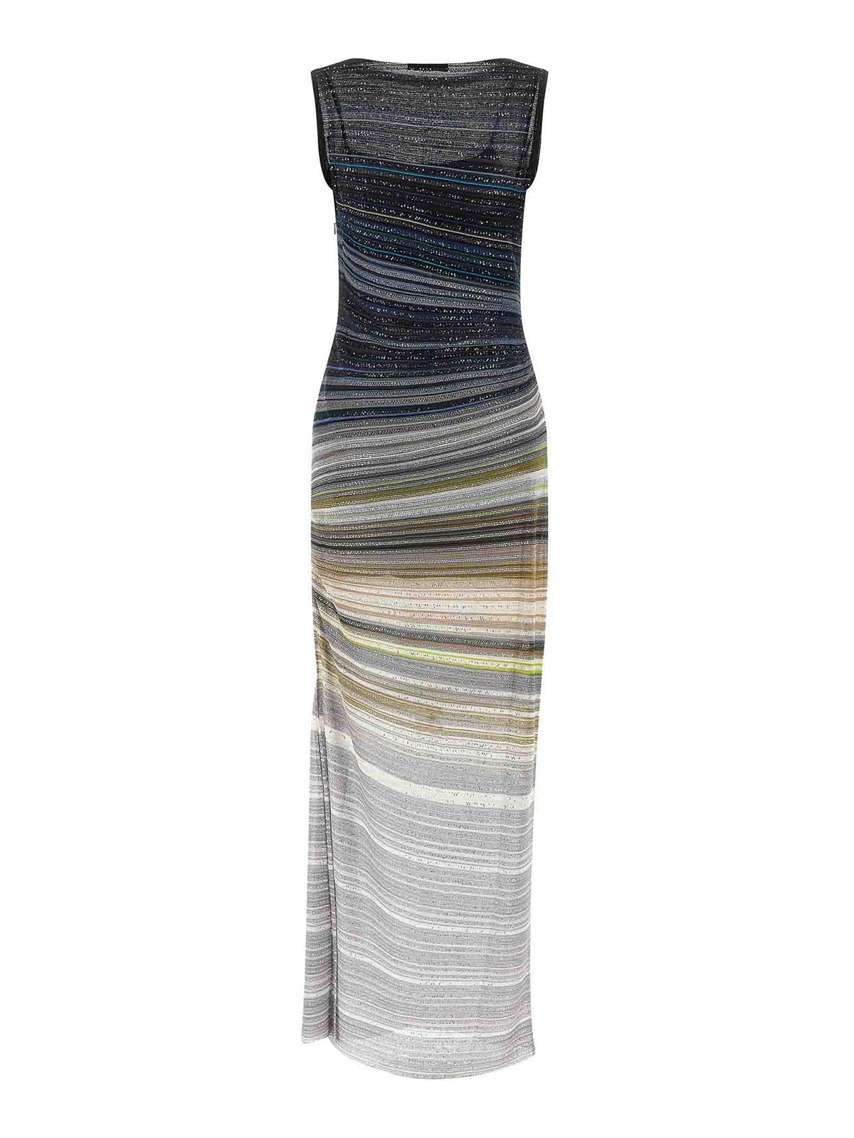 Long dress in viscose blend knit with lam thread and all over micro sequin processing, crew neck, semi-transparent with short petticoat inside, sleeveless.