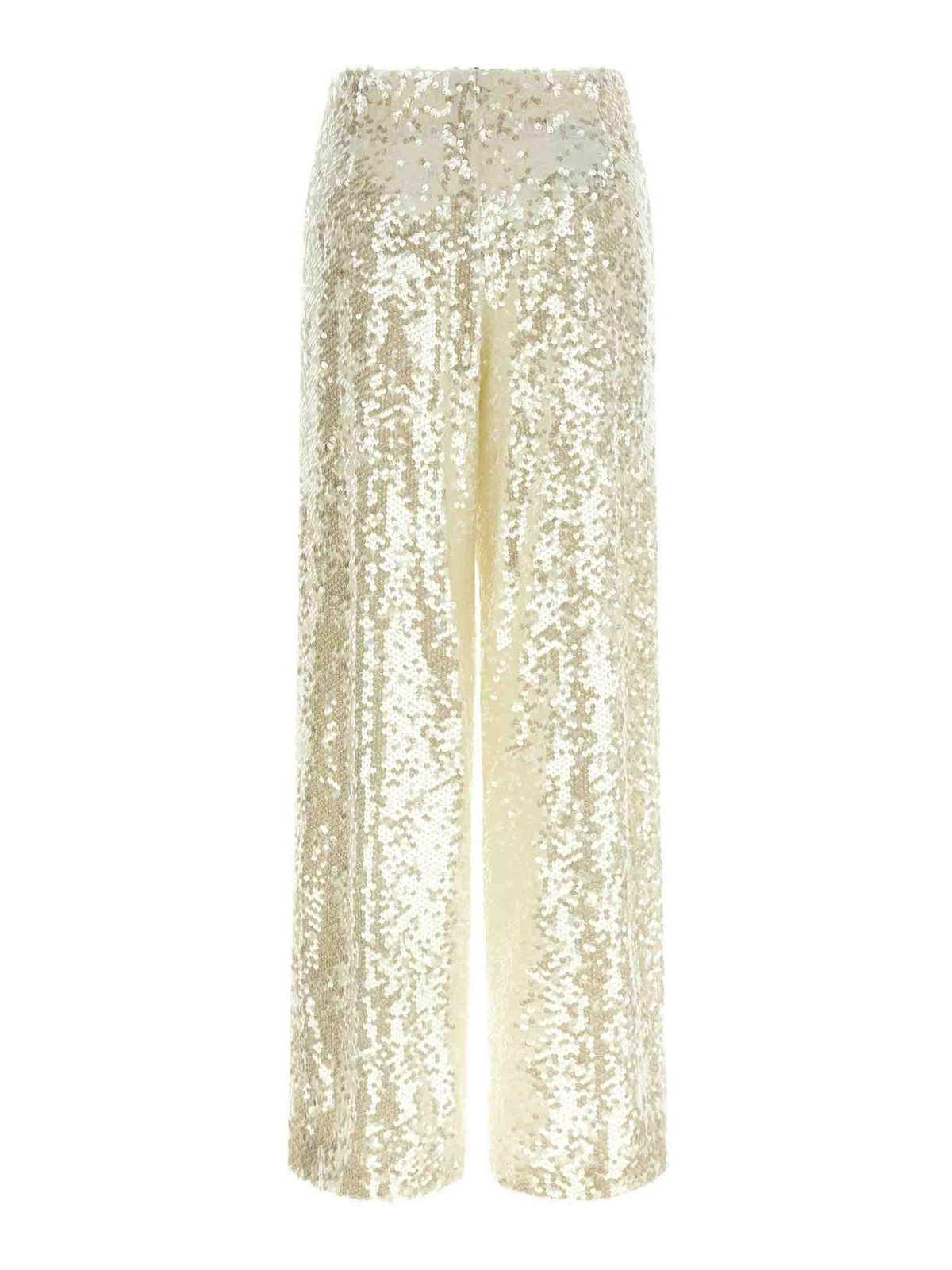 Fabric pants with all-over sequin application, wide and straight leg, high waist, zip and front button closure, pockets.