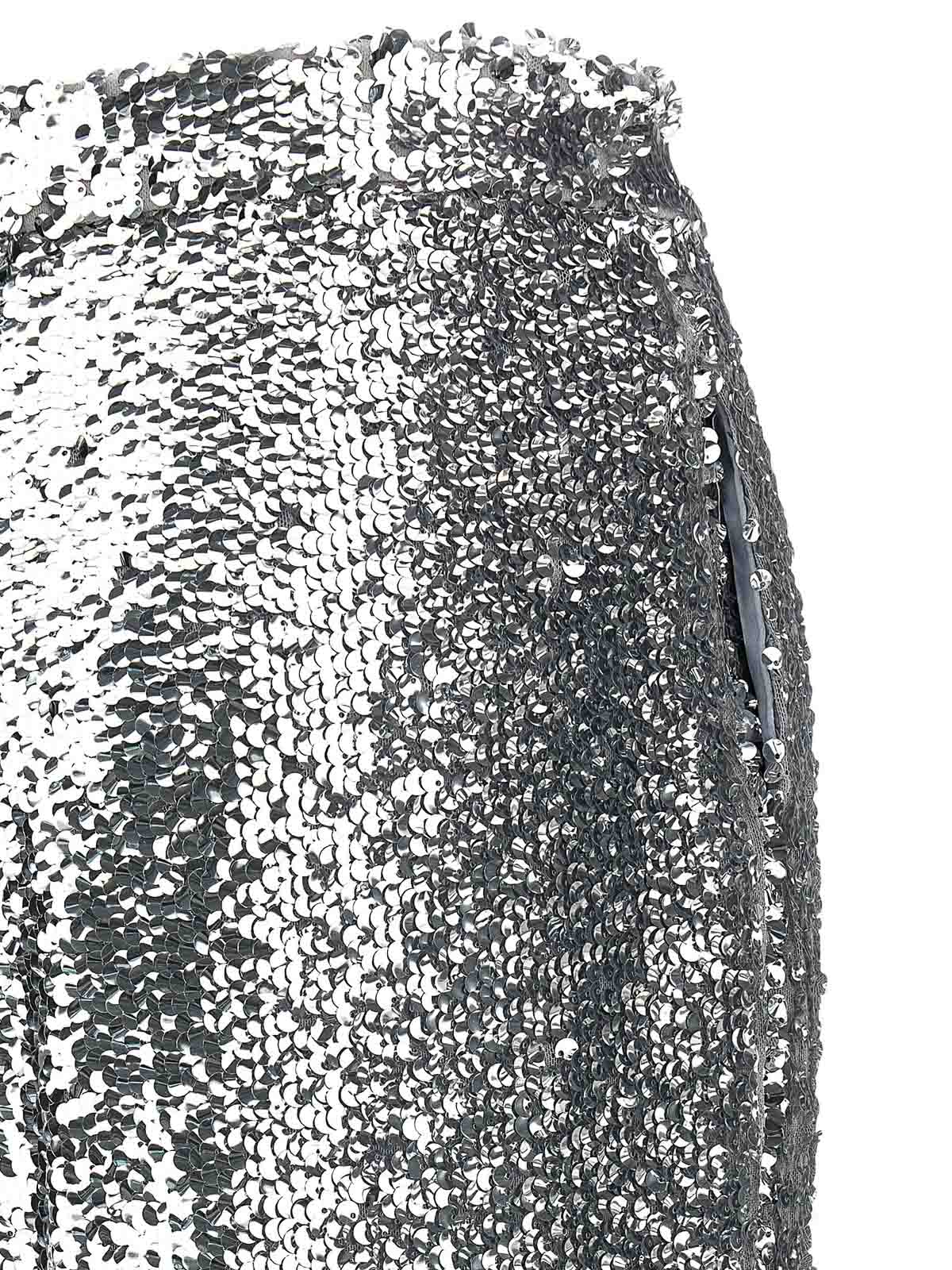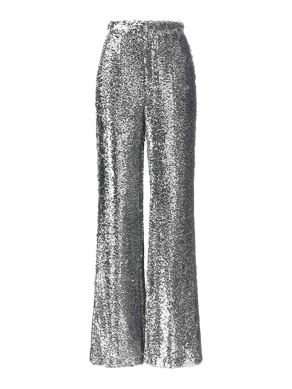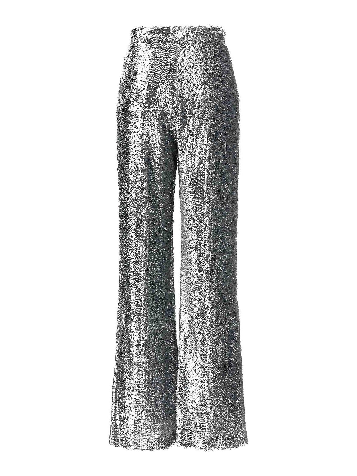 Silver sequin pants with high waist with straight leg side pockets zip and hook