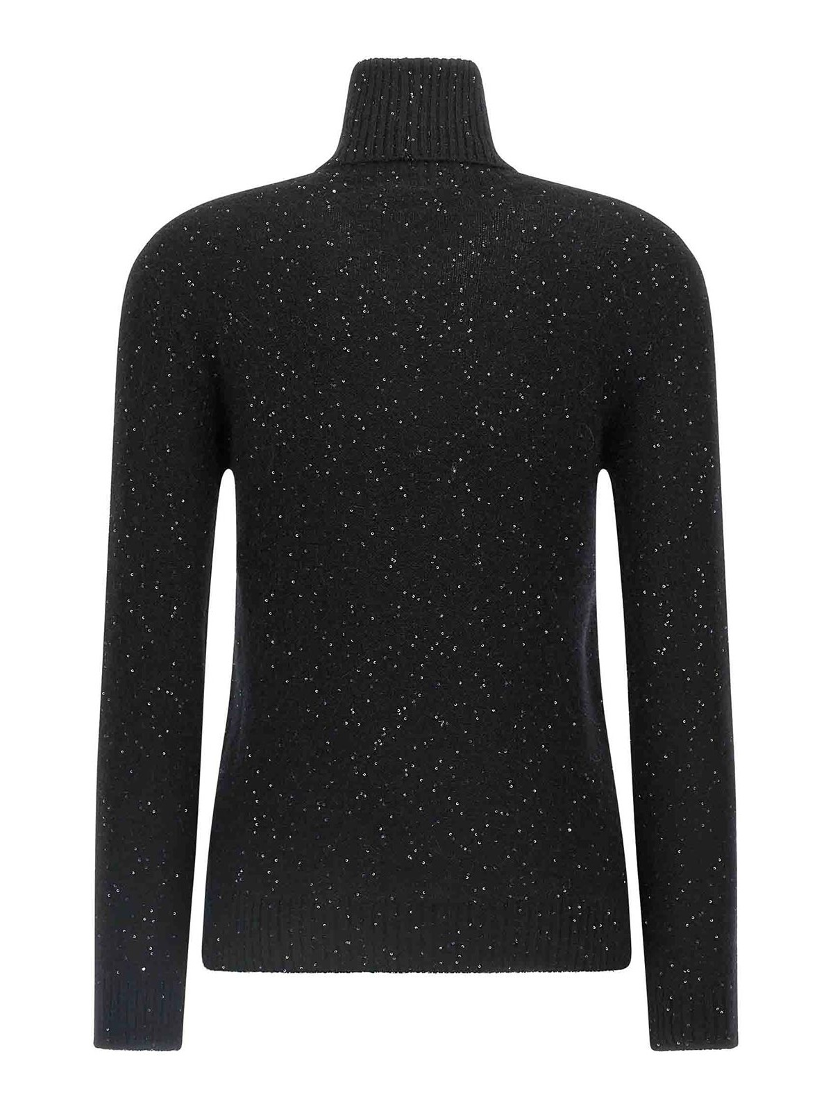Wool, silk and cashmere blend turtleneck sweater with all-over sequin appliqu, turned-up high neck, long cuffed mania.