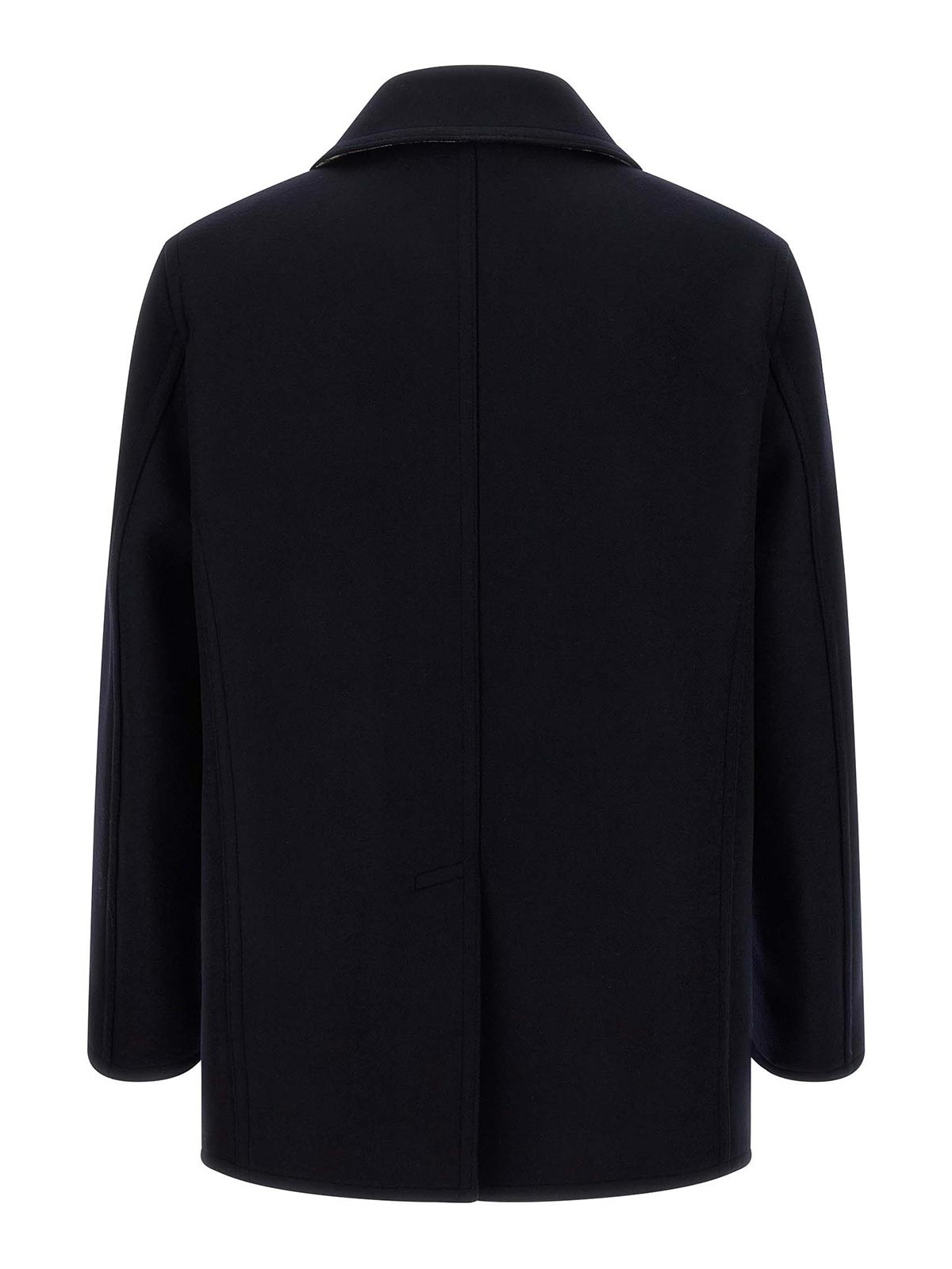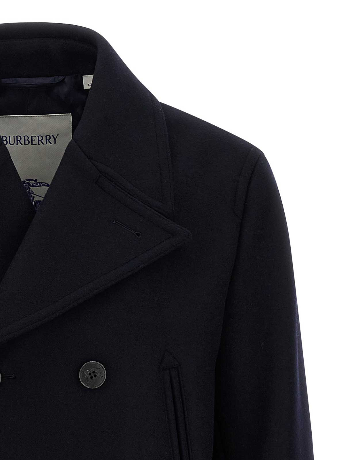 shelborne' coat tone on tone check double, breasted style with button with engraved 'equestrian knight design' on the lapel collar with and undercollar woven with burberry check pockets long sleeves