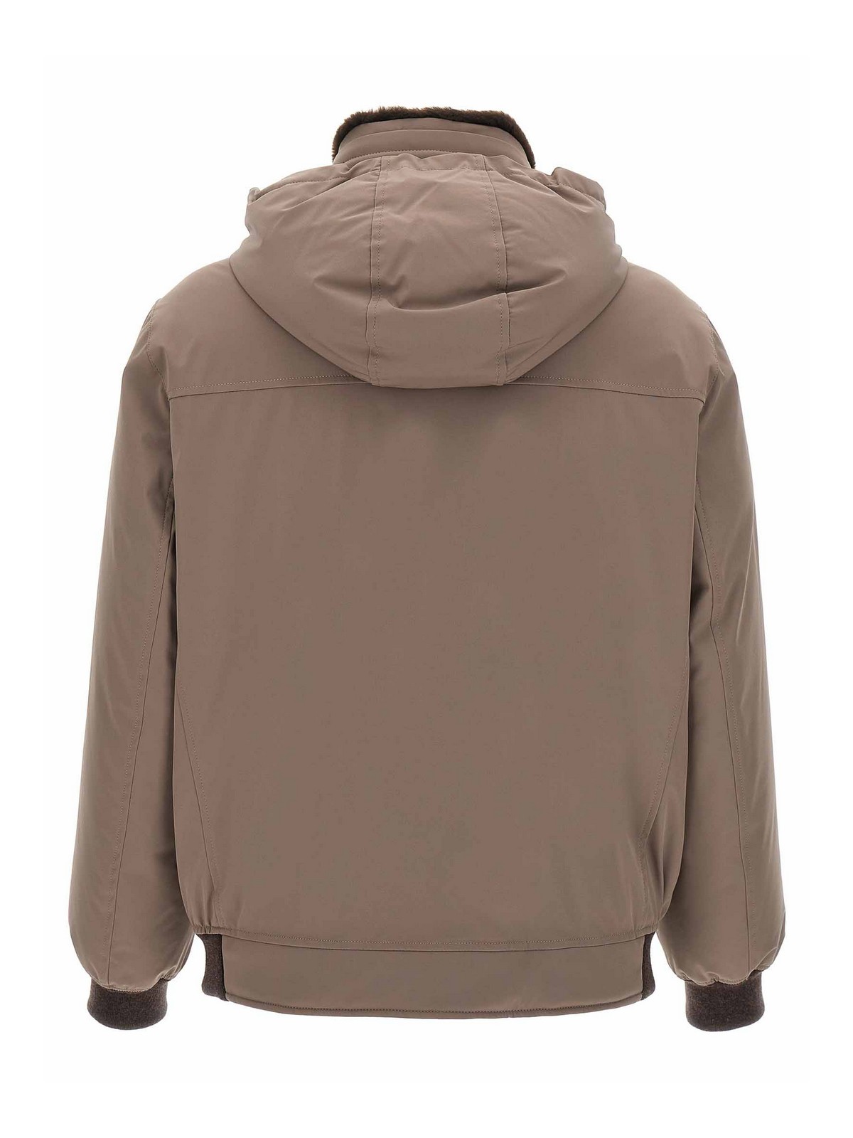 Water-repellent tech fabric bomber jacket, quilted lining with goose feather padding, stand-up collar with removable sherling lining, adjustable and removable hood, front zip closure, pockets, long sleeves with stretch ribbed knit cuffs.