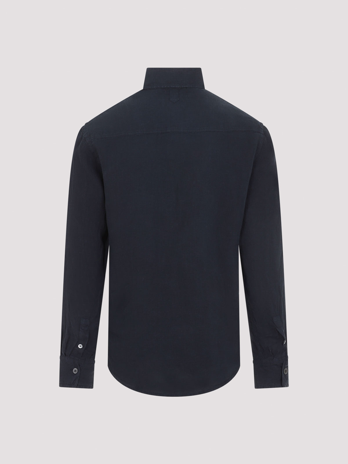Canali navy-blue linen shirt. pure navy-blue linen shirt, pointed collar, front buttoned fastening, chest patch pocket, long sleeves, buttoned cuffs, straight hem.