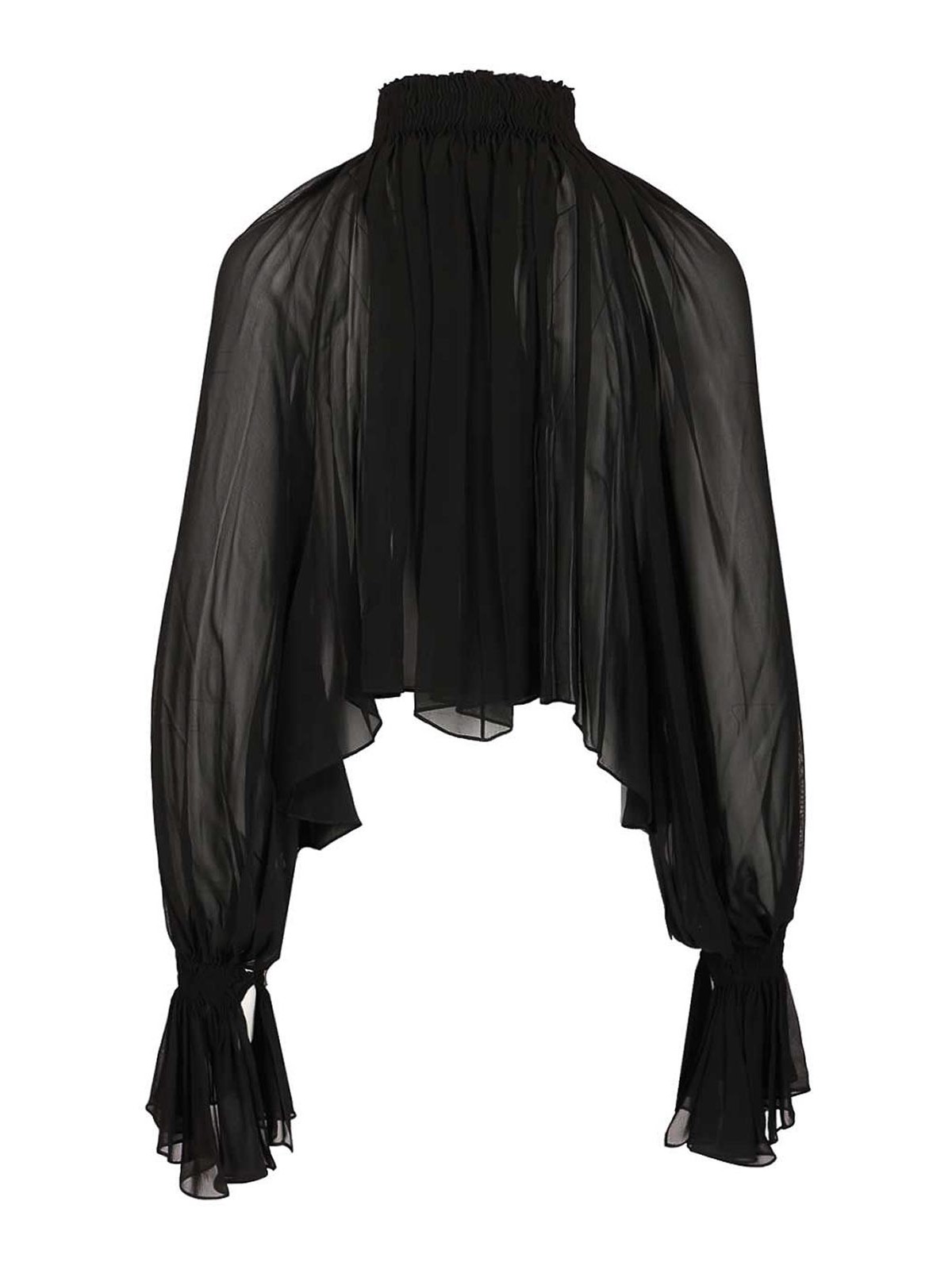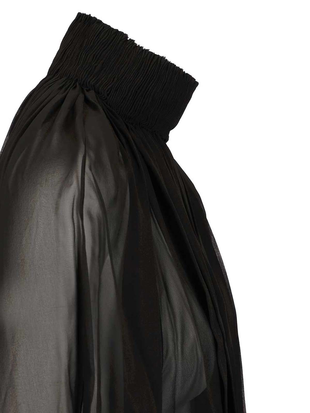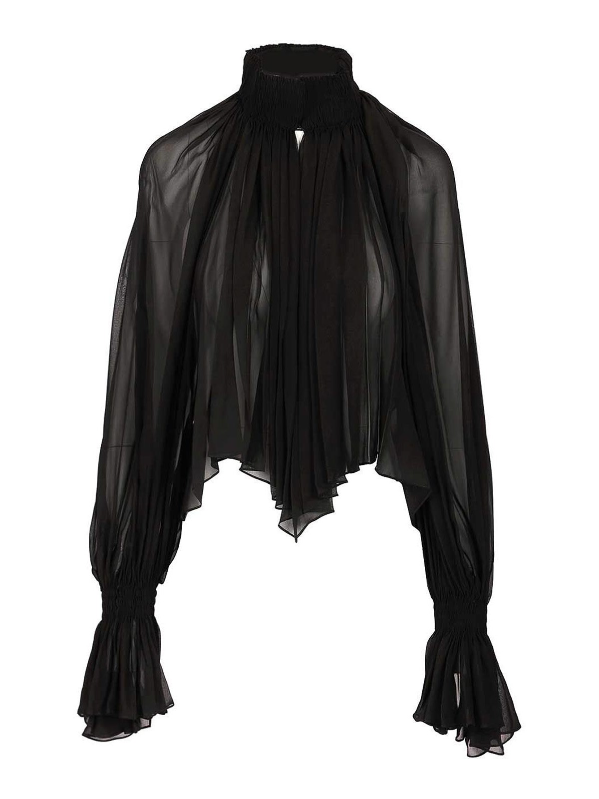 Khaite's flowing durer shirt featuring a high collar and a slit silhouette is enlivened by hand, crafted pleats and puffed sleeves that are tight at the wrist