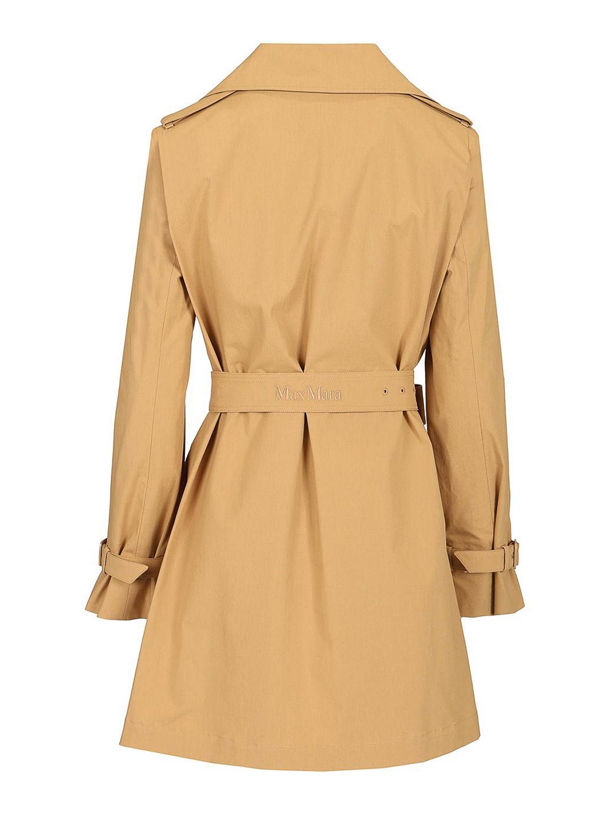 Short cotton trench coat from max mara, with shirt collar, raglan sleeves with adjustable straps at the bottom, welt pockets on both sides, double-breasted fastening with buttons and matching belt.