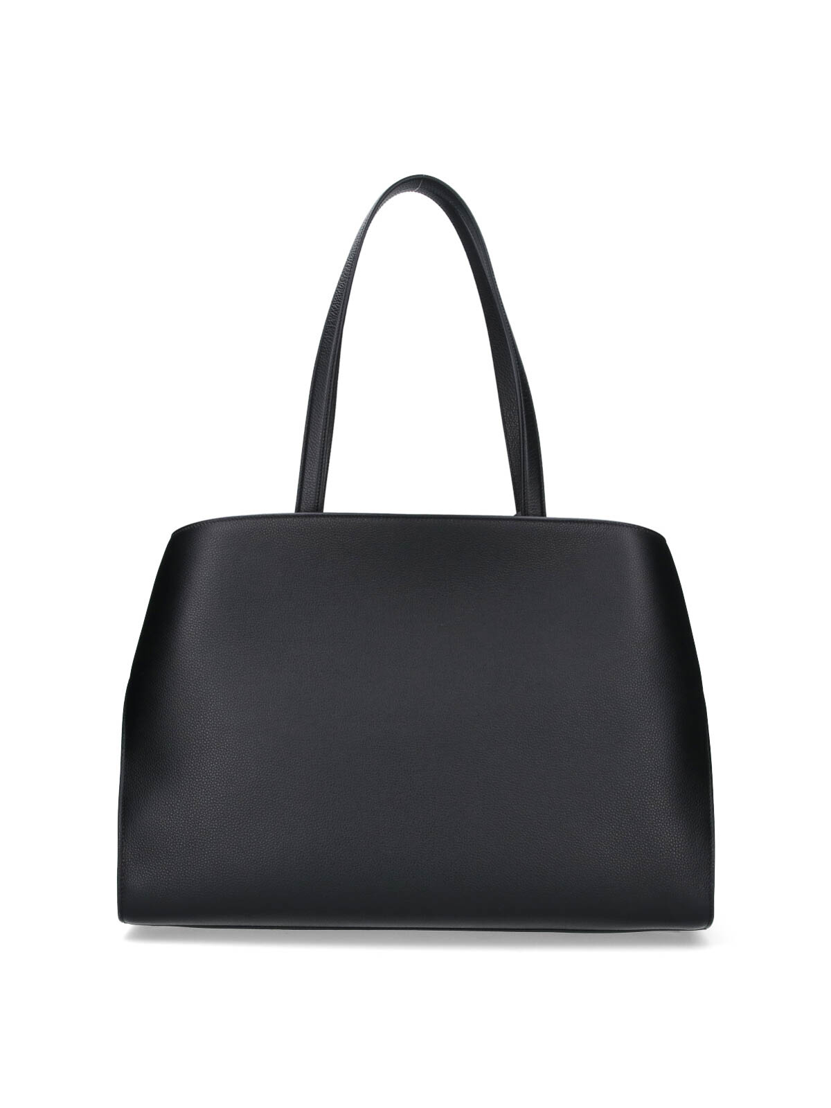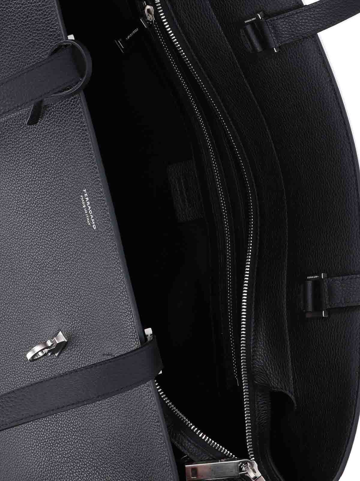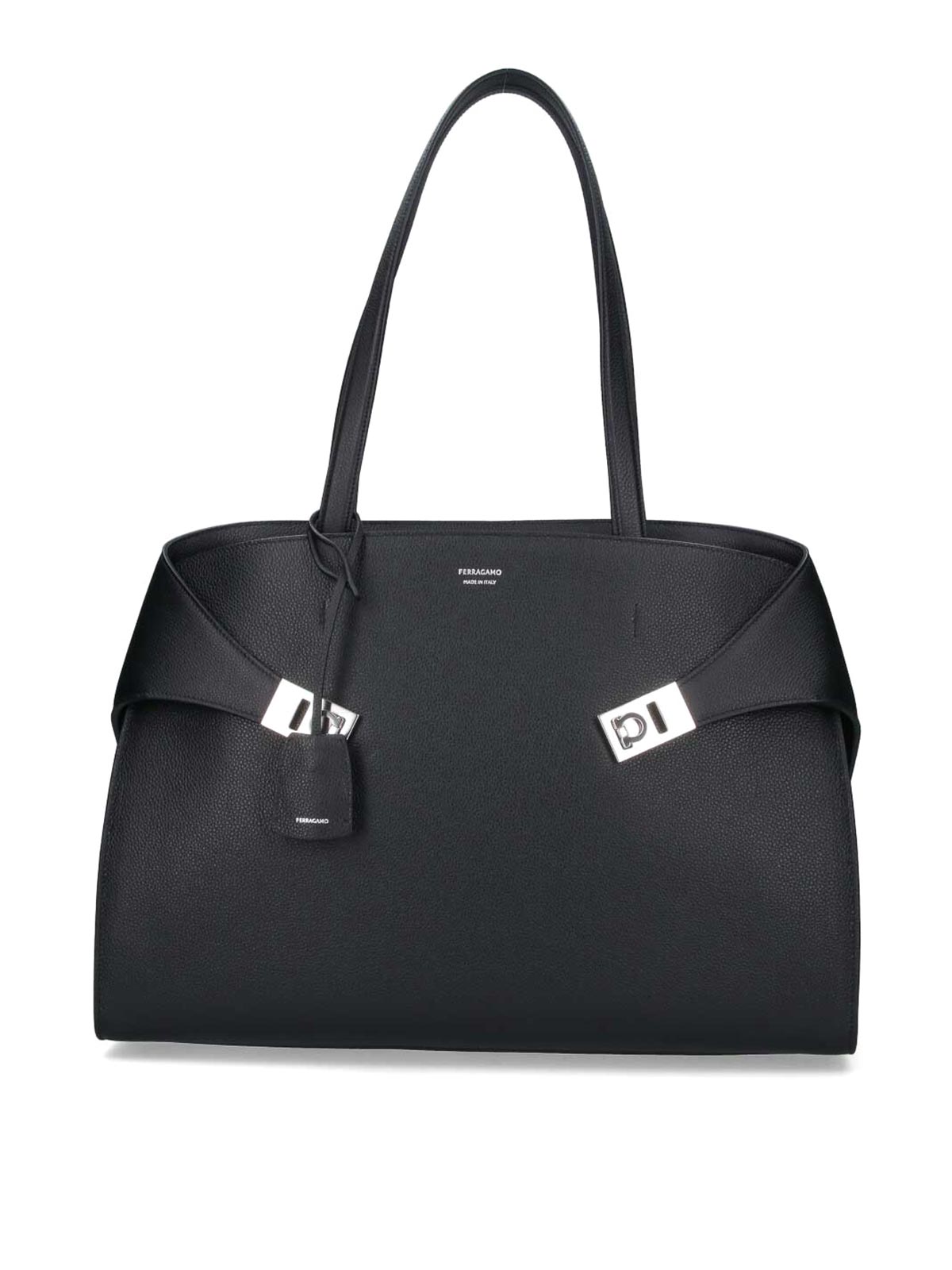 hug shoulder bag in black textured leather, two top handles, removable silver metal ring key ring, adjustable and removable shoulder strap, twist strap closure, metal gancini logo buckle detail, one internal zip pocket, one main internal compartment, metal feet on the bottom.