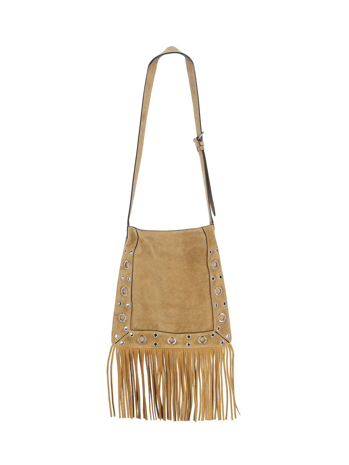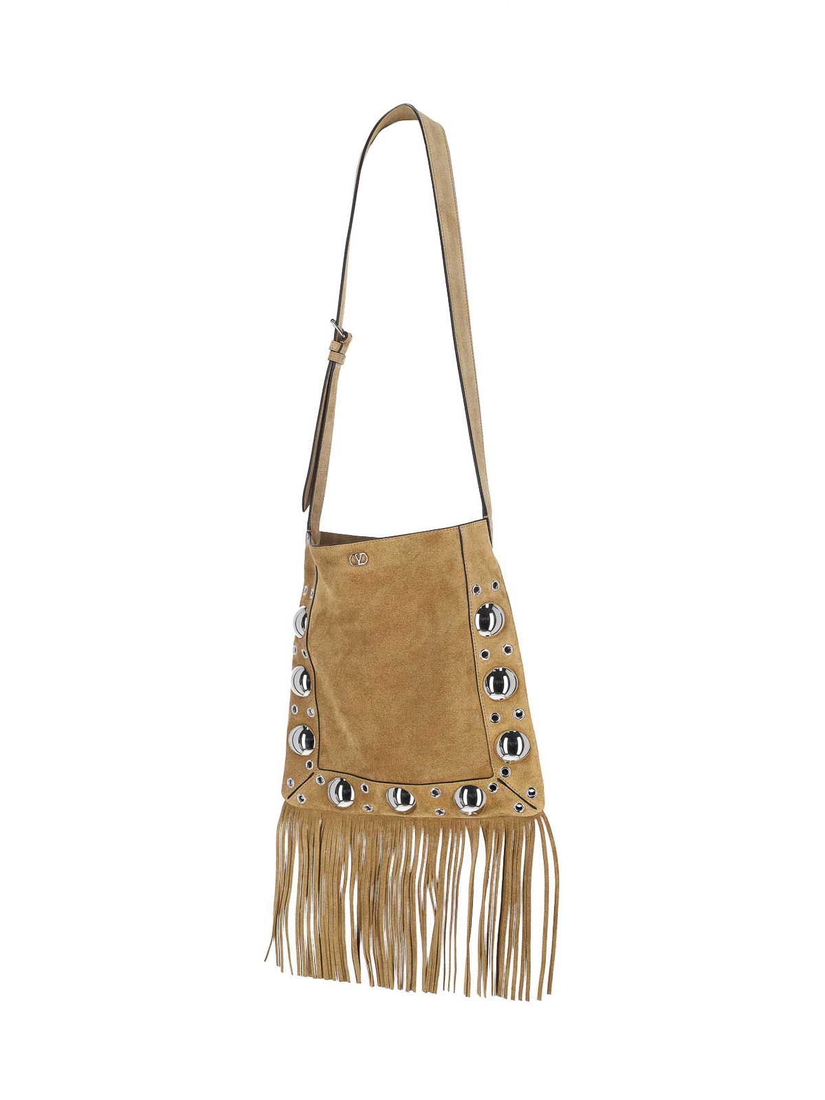 Valentino Garavani nellcte shoulder bag, in beige suede, studs motif in silver metal, adjustable shoulder strap, vlogo signature logo in silver metal on the front, fringes on the front, one main internal compartment.