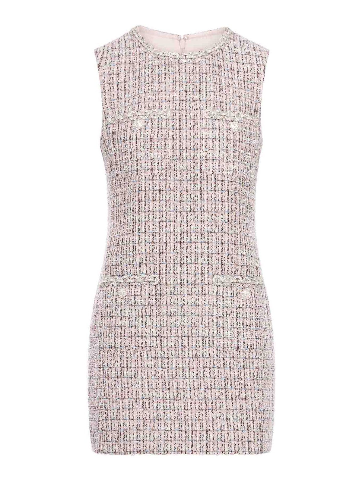 Mini dress boucl, crew neck with rhinestones, sleeveless, fitted fit, this style has minimal stretch, back zip, trim, four pockets, color pink