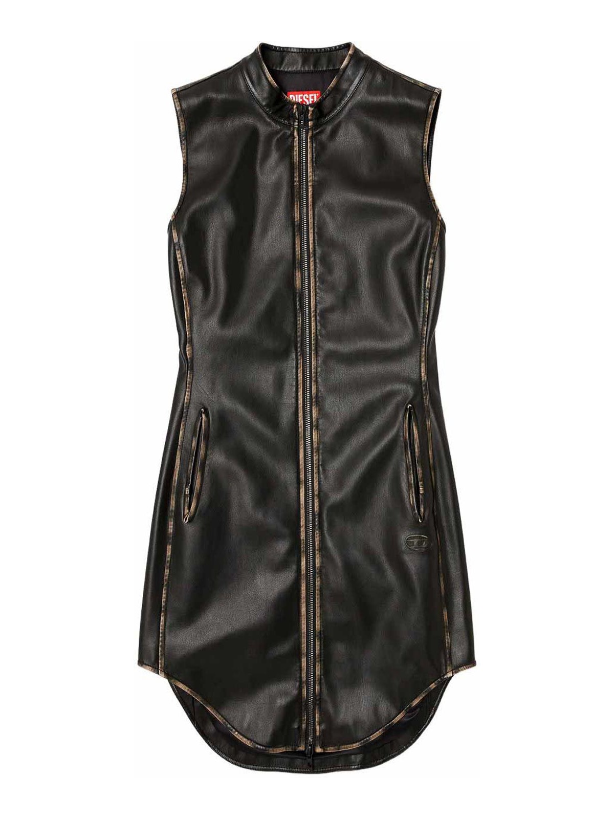 The 'd-eneas' sleeveless short dress by diesel is a feminine model inspired by men's shirts, made of black technical fabric with a hand-brushed glossy finish that creates a lived-in effect, it features a front zip, rounded hem, a fitted fit and a sleeveless design with a strong biker feel, diesel, 'd-eneas' short dress, black, technical fabric, hand-brushed lived-in finish, zip fastening, rounded hem, fitted fit, sleeveless