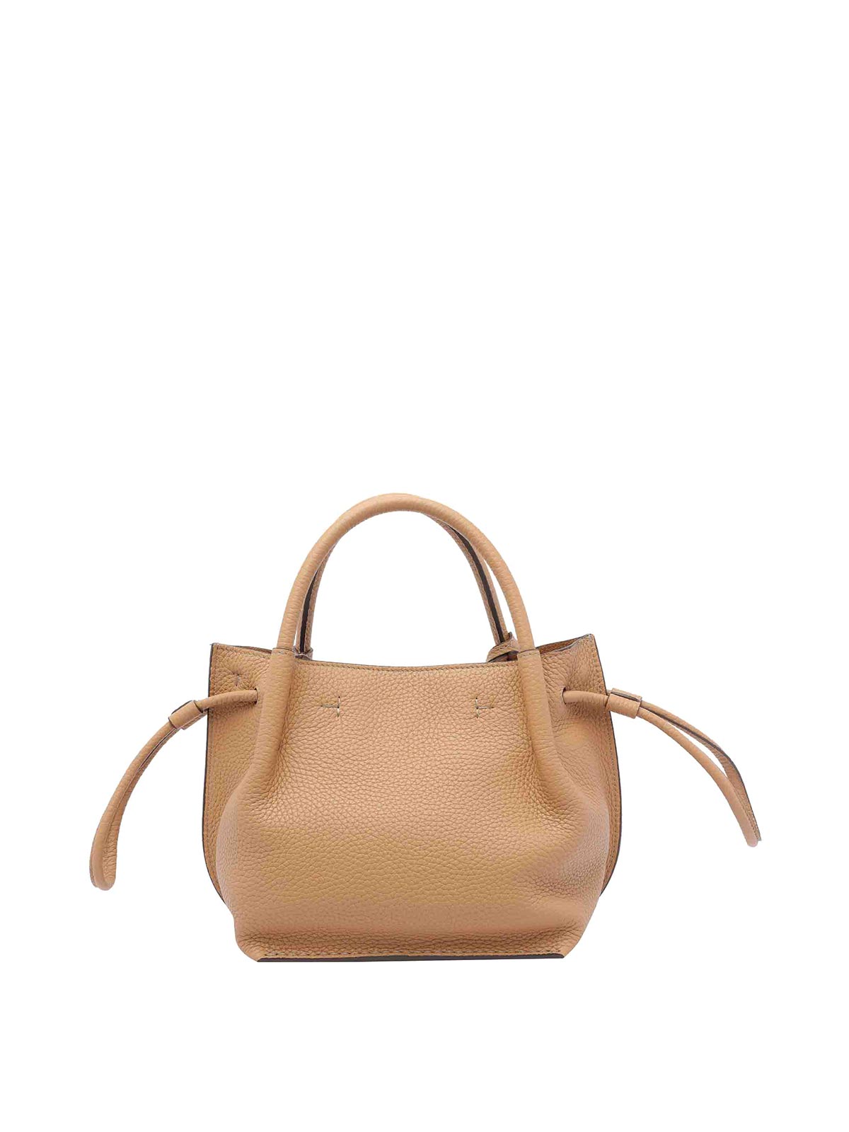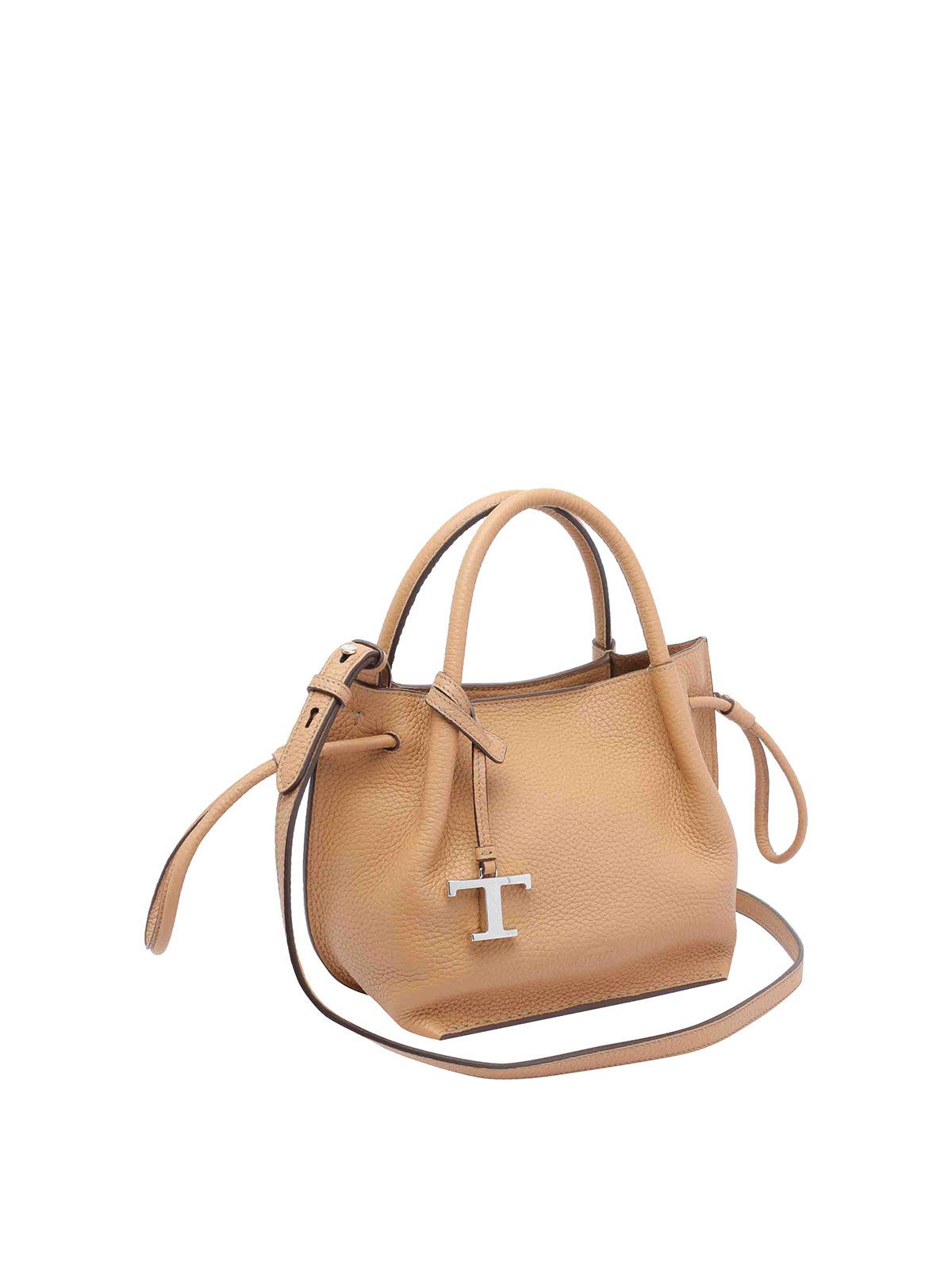 Tod's beige small leather bucket bag, magnetic closure, inner zipped pocket, 2 handles, adaptable and removable strap, logo charm
