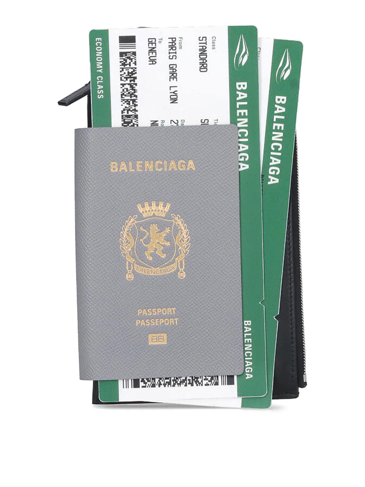 Balenciaga passport smartphone holder, in gray calfskin, multicolor trompe-l'il two ticket print motif, adjustable and removable shoulder strap, zip closure, one flat back pocket, three internal card slots, one main internal compartment.
