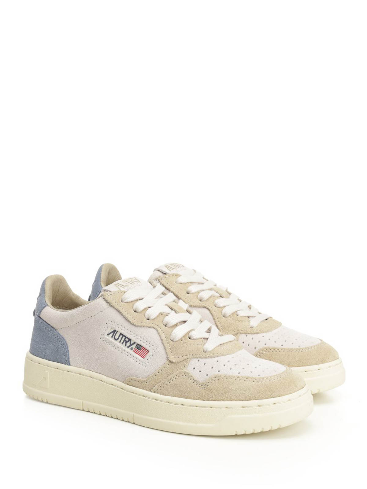 Autry medalist low sneaker with leather upper, micro-perforated toe, flat cotton laces, padded collar, rubber sole.