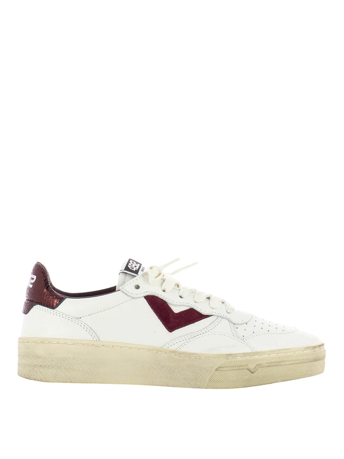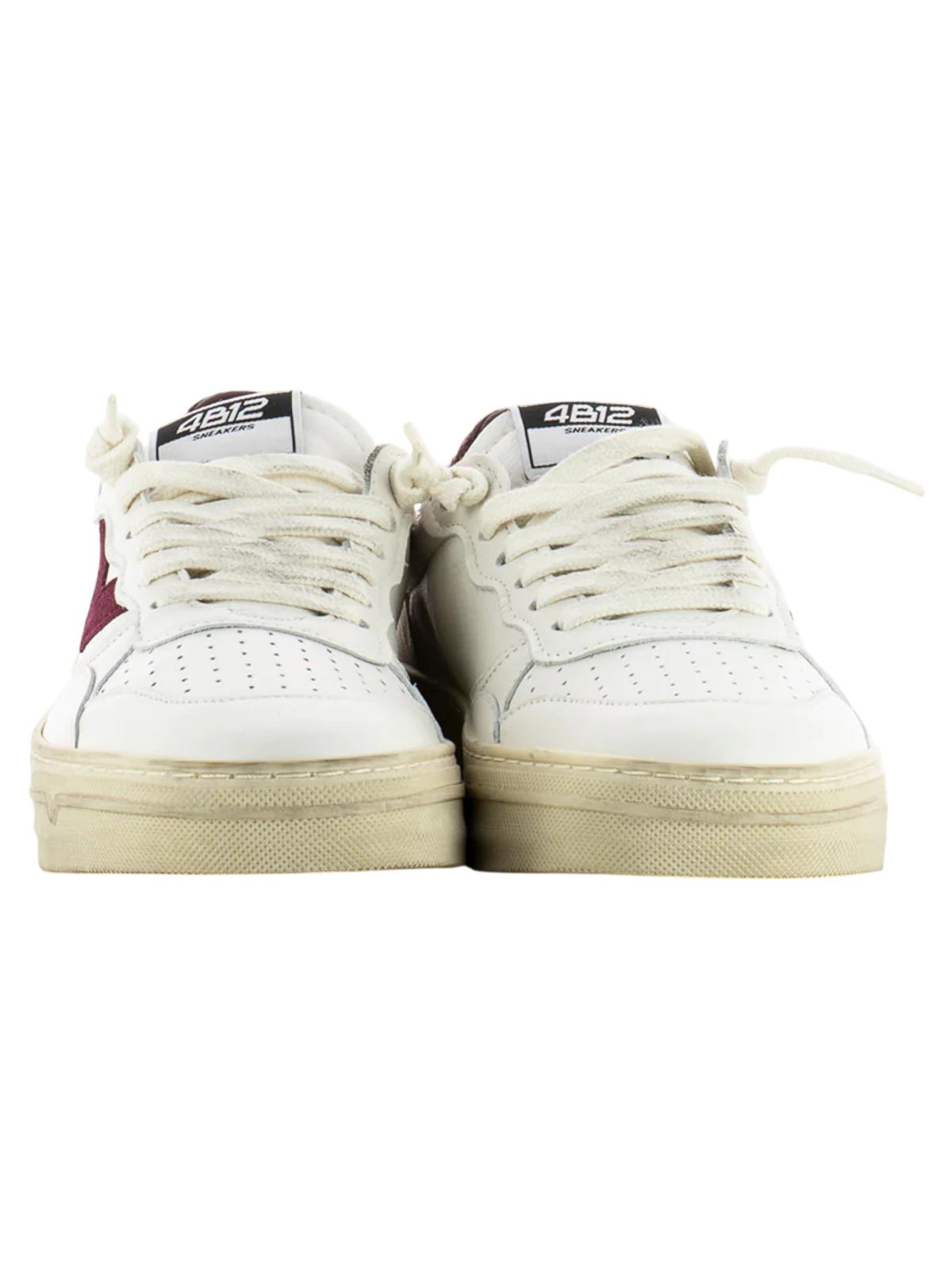4b12 hyper d125 white/bordeaux sneakers made with craftsmanship and high quality materials, the 4b12 sneakers express a perfect balance between contemporary style and everyday comfort. This made in Italy model features a white leather upper with burgundy suede inserts, enriched with python-effect details on the heel and dirty-effect laces for a look with a lived-in character. the vintage-effect rubber bottom, 3 cm high, ensures stability and a retro touch, while the micro-perforated tip promotes breathability. to complete the design, the lettering logo printed on the heel, a distinctive symbol of the brand.
