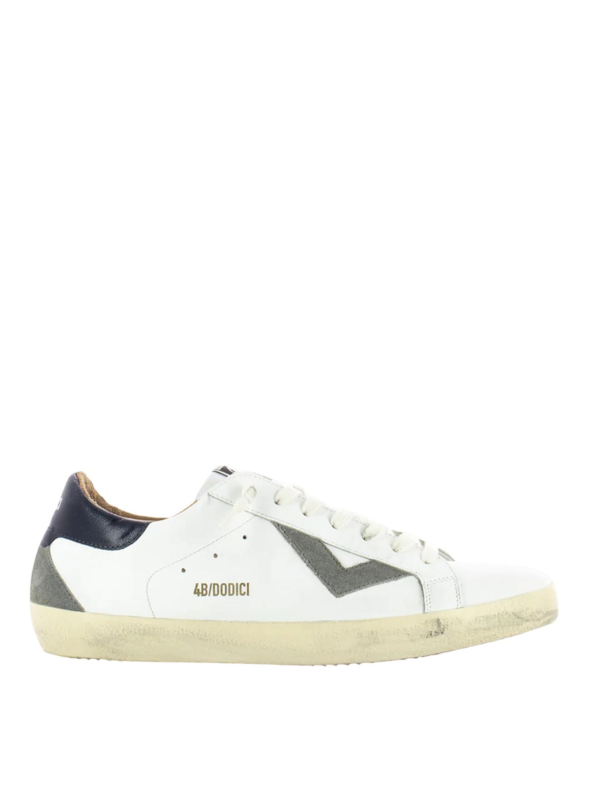 4b12 suprime men's sneaker u217 white/blue artisan style sneaker signed 4b12, made entirely in Italy with high quality materials. the suprime u217 model features a white leather upper with blue suede inserts, a refined mix that combines elegance and sporty character. the internal sponge lining ensures comfort and breathability, while the used-effect rubber sole gives a vintage and gritty look. the dirty-effect cotton laces and the lettering logo printed on the heel, distinctive signs of the brand, complete the design.